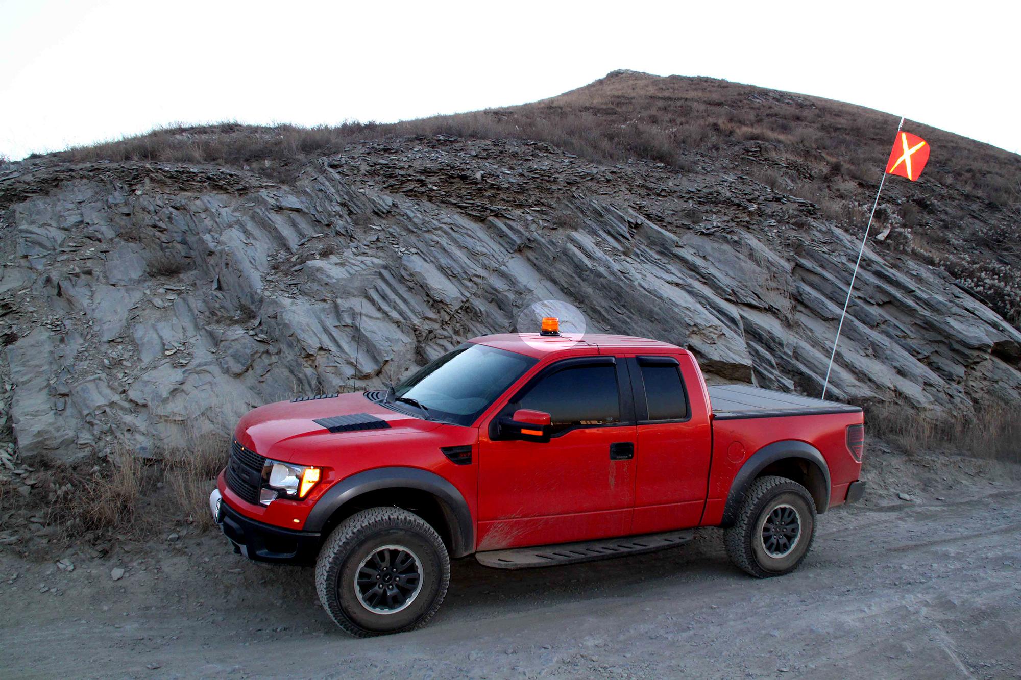 This off-road pickup truck is outfitted with a 12ft SafetyWhips® All-Weather Super Duty Powered Warning Whip with Orange “X” Safety Flag & SC4 Series LED Whip Light. Also shown is our Helios X-MOD Series Amber LED Beacon (short profile).