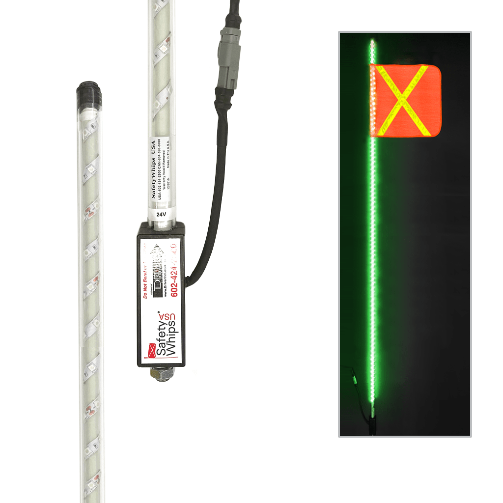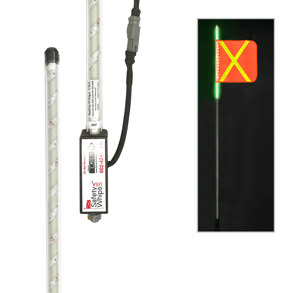 SafetyWhips® Super Duty LED Powered Warning Whips are the toughest LED whip available. They feature protected LED lighting from top to bottom for maximum vehicle visibility beneficial to vehicles and equipment in extreme and harsh weather conditions. These safe and non-conductive Super Duty LED Fiberglass Whips are extremely durable and built to handle all environmental conditions that your vehicle and equipment may experience. Mine-tough and made of a solid fiberglass internal pole, these whips are protected against impact with their rugged polycarbonate external tubing. They are engineered to equalize pressures while blocking water & contaminants. Standard whip lengths are available from 4ft (1.22m) up to 12ft (3.66m), and custom sizes are available upon request. Various accessories and LED whip light color options are also available, including safety flags, mounts, single and dual color LED light combinations.