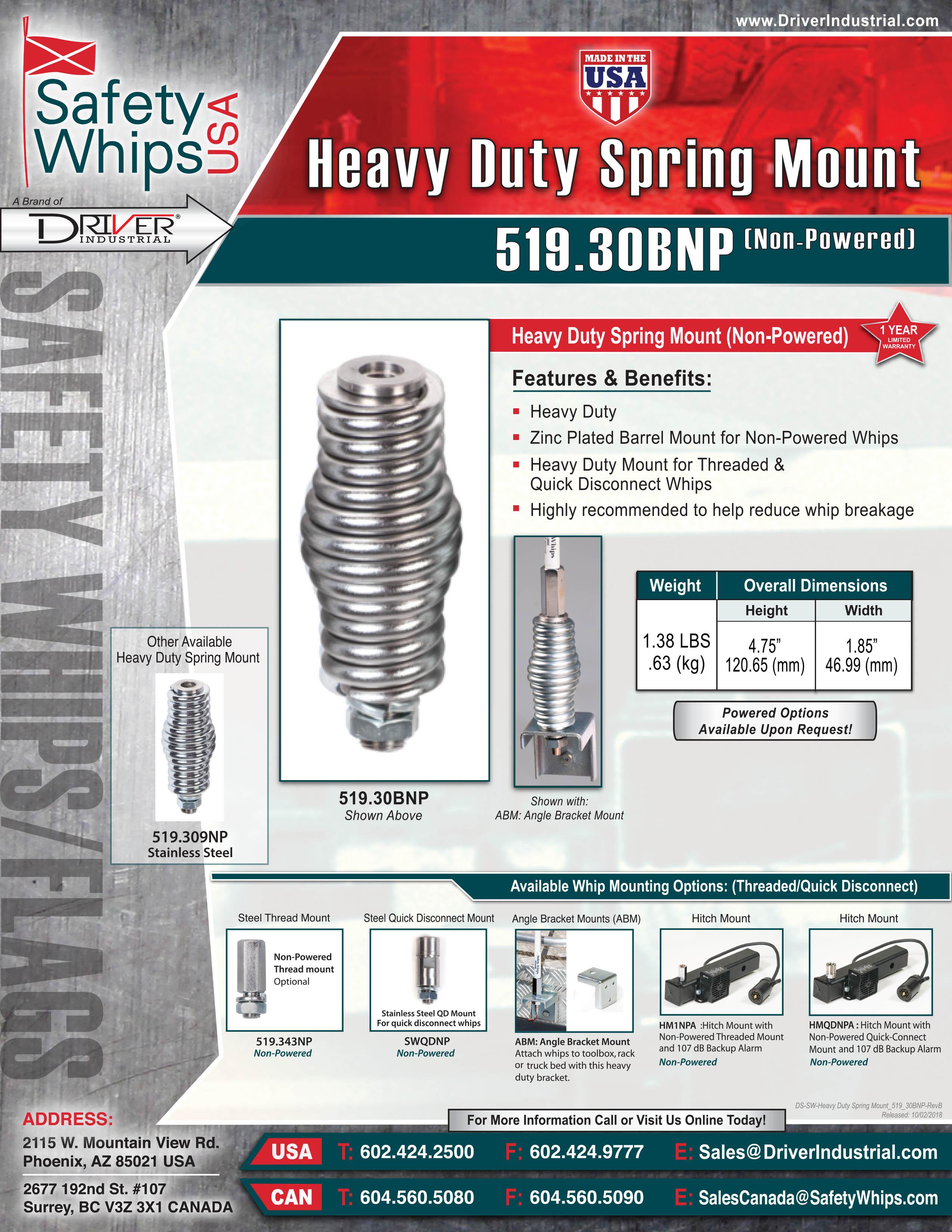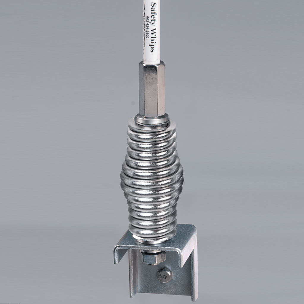 SafetyWhips® Spring mounts are highly recommended to help reduce whip breakage and wear and tear on whip. The spring provides a higher threshold for jarring and jolting as it reduces the amount of pressure placed on the whip pole when jolted driving your vehicle over rocky rough terrain or heavy equipment jolts from use of heavy equipment.