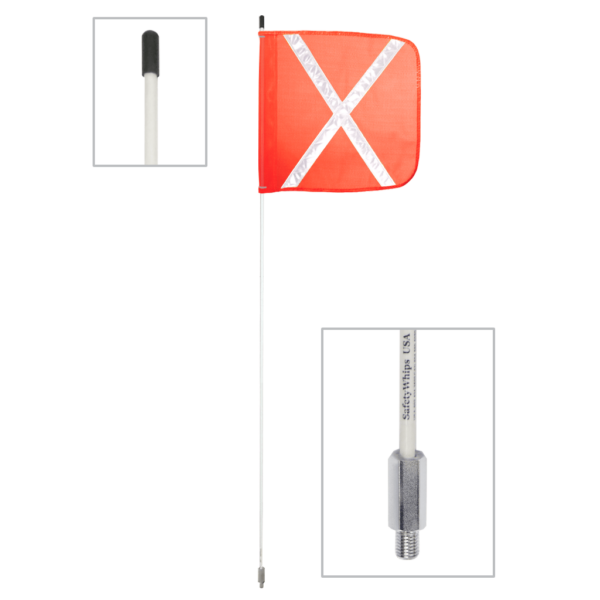 5' Light Duty, All Weather Fiberglass Warning Whip. 5/16" Whip Diameter. This 1 Piece Non-Powered Whip has a Threaded Base on the bottom. This Whip includes an Orange Mesh 16" x 16" Flag with a White Reflective ''X''.