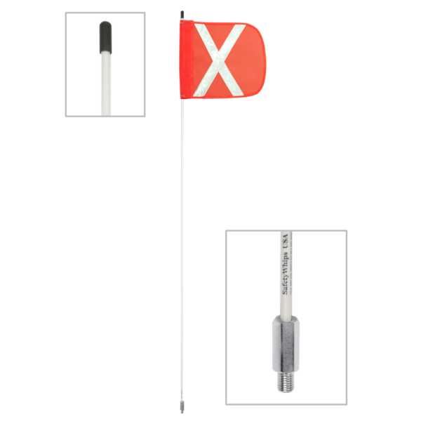 7' Light Duty, All Weather Fiberglass Warning Whip. 5/16" Whip Diameter. This 1 Piece Non-Powered Whip has a Threaded Base on the bottom. This Whip includes an Orange Mesh 11.5" x 11.5" Flag with a White Reflective ''X''.