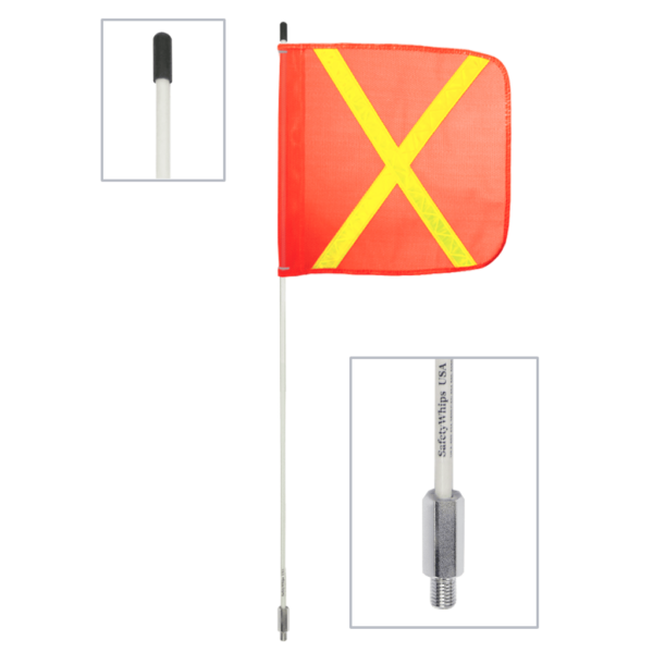 3' Light Duty, All Weather Fiberglass Warning Whip. 3/8" Whip Diameter. This 1 Piece Non-Powered Whip has a Threaded Base on the bottom. This Whip includes an Orange Mesh 16" x 16" Flag with a Yellow Reflective ''X''.