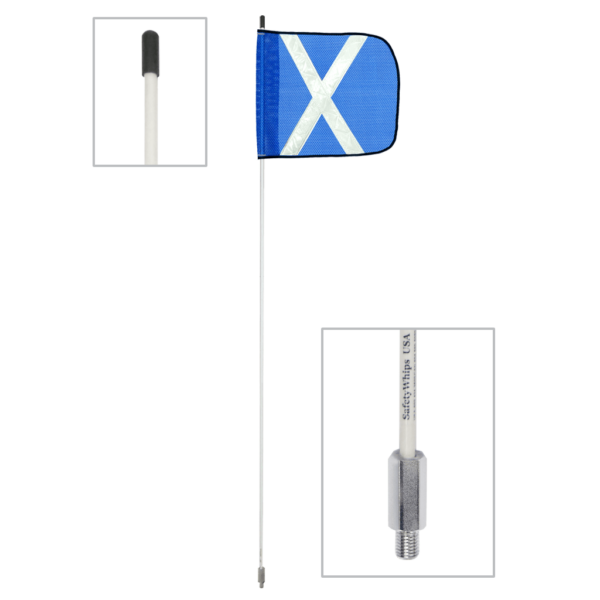 5' Light Duty, All Weather Fiberglass Warning Whip. 3/8" Whip Diameter. This 1 Piece Non-Powered Whip has a Threaded Base on the bottom. This Whip includes a Blue Mesh 11.5" x 11.5" Flag with a White Reflective ''X''.