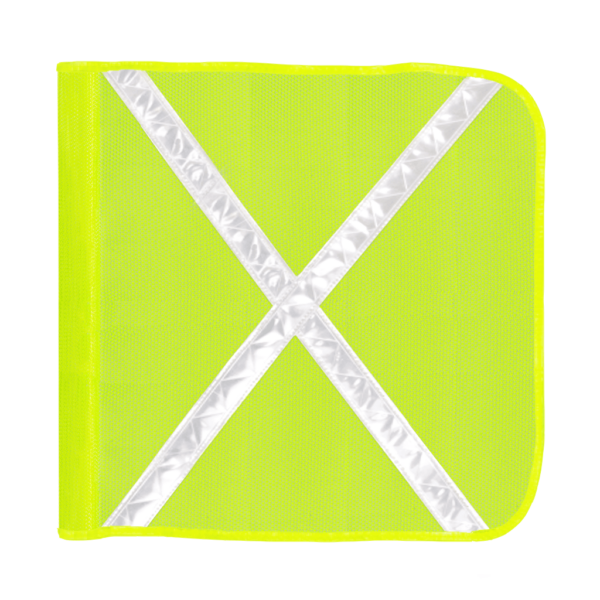 18" x 18" Fluorescent Yellow Mesh Flag With Reflective White X. This is a Hi-Visibility Fluorescent Safety Flag. UV resistant, anti-microbial and fray resistant. ** Includes Flag Attachment Clamps