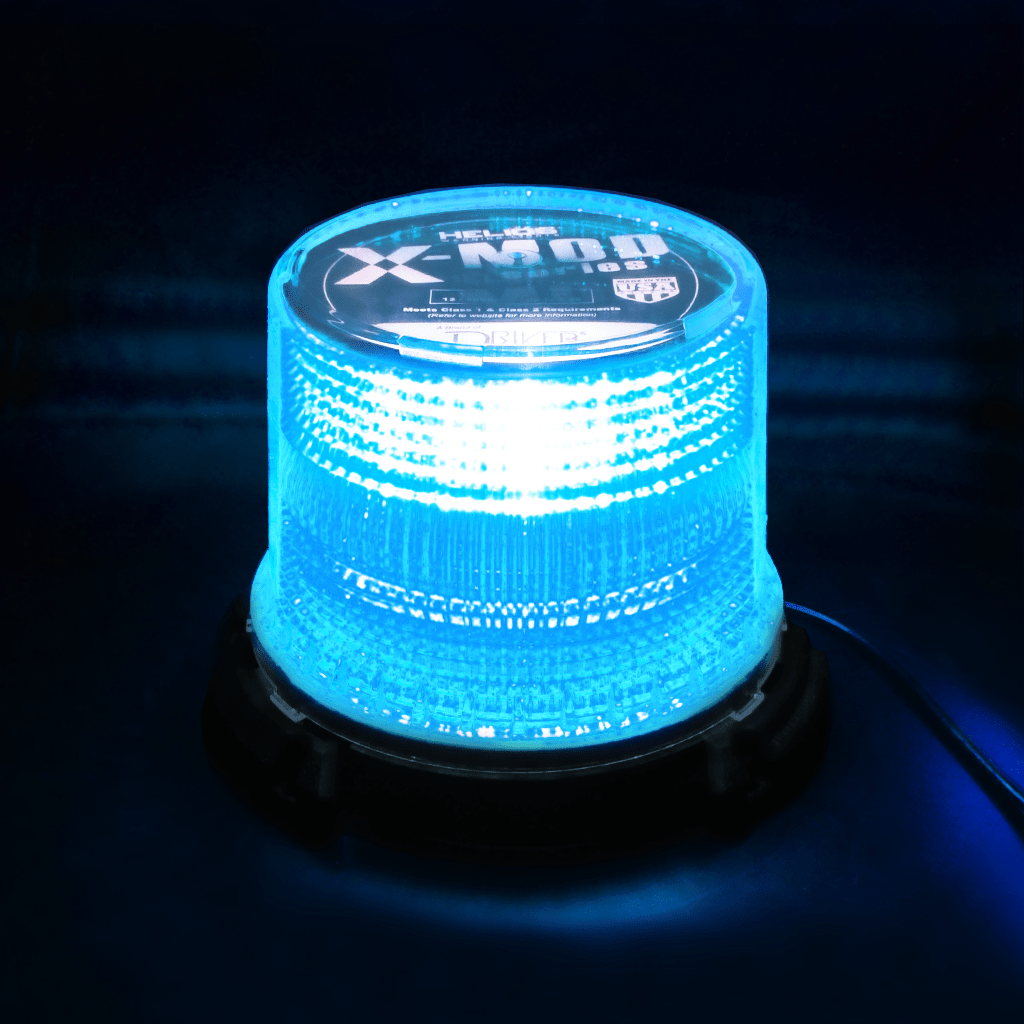 HELIOS X-MOD Heavy Duty Interchangeable (Blue) LED Beacon Features Replaceable Parts, Artificial Intelligence, 10 Programmable Flash Patterns, Photosensor For Programmable Night Only Barricade Mode Operation, Programmable Night Dimming Mode To Avoid Glare, Impact Resistant Dust Dome, Optically Enhanced (CLEAR) Profile Lens, (Blue) LEDs, Permanent Mount. 12" Pigtail For Power Connection, 6.65 H x 6.5 W, 10-48Vdc; 1.25 Max Amps. Meets SAE Class 1, Title 13, CE, IP67, IP69K, RoHS & DOT Requirements.