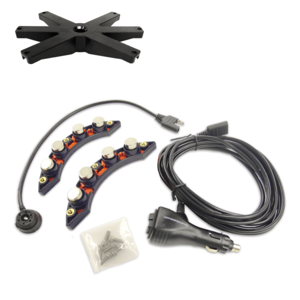 1" Pipe Mount to Magnetic Mounts Conversion Kit. Includes Two Magnetic Mounting Pads, Hardware, Hardware, 12" Pigtail Power Connection For Quick Connection To The Cigarette Power Supply, And The Cigarette Power Supply.