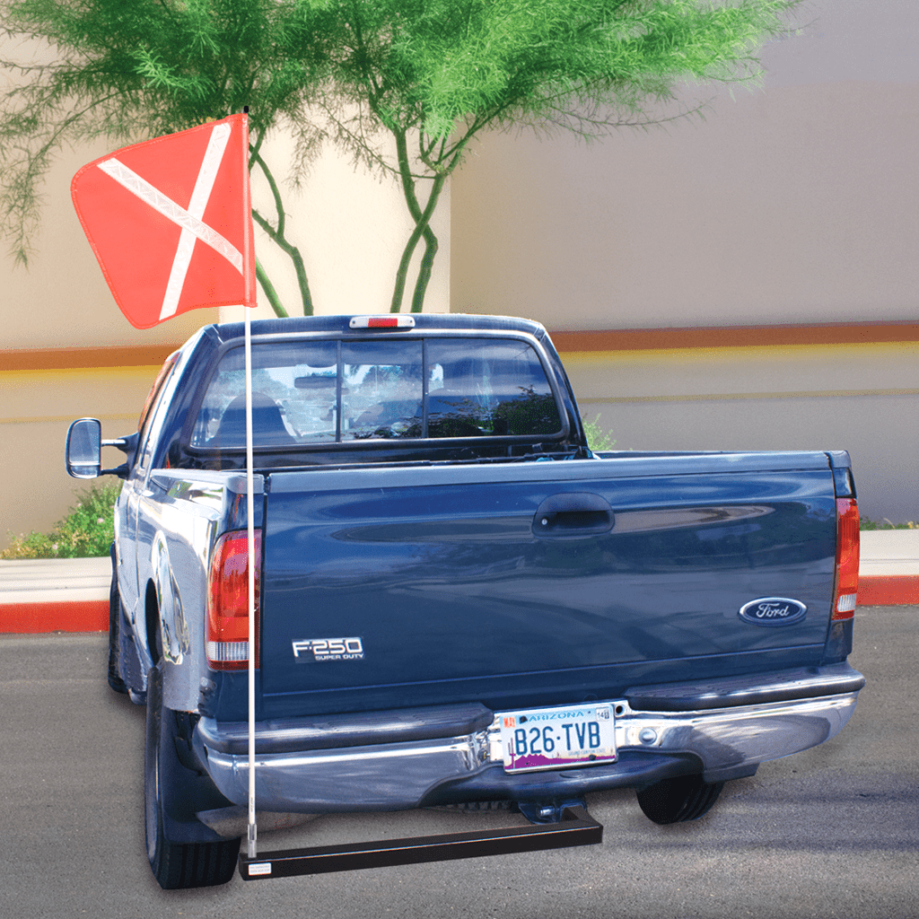 SafetyWhips® offers both regular sized Hitch Mounts and Extended Hitch Mounts either powered or not powered with an option to add a backup alarm for all of our whips and mount options. SafetyWhips® Extended Hitch mount options are often used to attach a whip without permanent installation to your vehicle body as well as enable use of the bed of the truck for tailgate access or rear hatch access when needed.