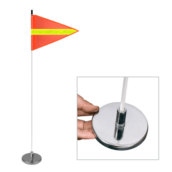 3' Light Duty Whip with a Powerful 220# Magnet Mount. All Weather Fiberglass, Heavy Duty Base. 5/16" Whip Diameter. This whip includes an Orange Mesh Pennant 9" x 12" flag with a Yellow Reflective Stripe.