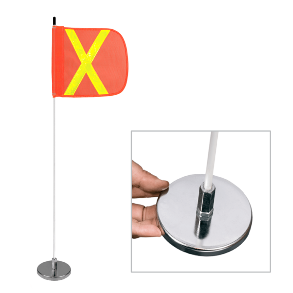 3' Light Duty Whip with a Powerful 220# Magnet Mount. All Weather Fiberglass, Heavy Duty Base. 5/16" Whip Diameter. This whip includes an Orange Mesh 11.5" x 11.5" flag with a Yellow Reflective ''X''.