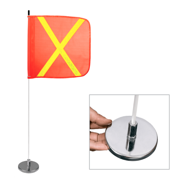 3' Light Duty Whip with a Powerful 220# Magnet Mount. All Weather Fiberglass, Heavy Duty Base. 5/16" Whip Diameter. This whip includes an Orange Mesh 16" x 16" flag with a Yellow Reflective ''X''.