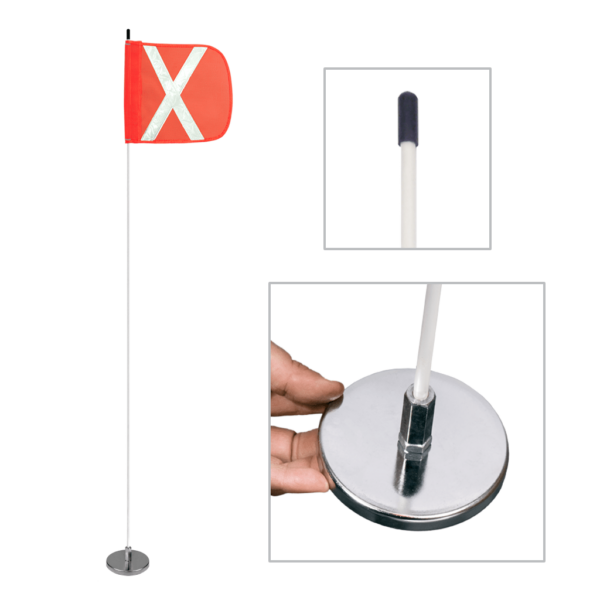 6' Light Duty Whip with a Powerful 220# Magnet Mount. All Weather Fiberglass, Heavy Duty Base. 5/16" Whip Diameter. This whip includes an Orange Mesh 11.5" x 11.5" flag with a White Reflective ''X''.