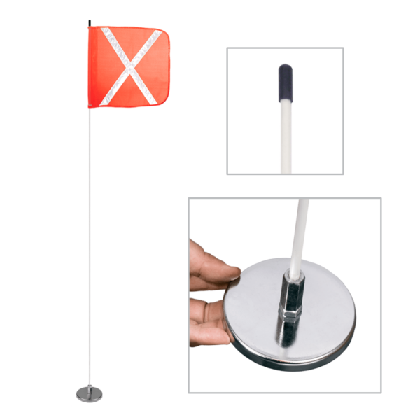 7' Light Duty Whip with a Powerful 220# Magnet Mount. All Weather Fiberglass, Heavy Duty Base. 5/16" Whip Diameter. This whip includes an Orange Mesh 16" x 16" flag with a White Reflective ''X''.