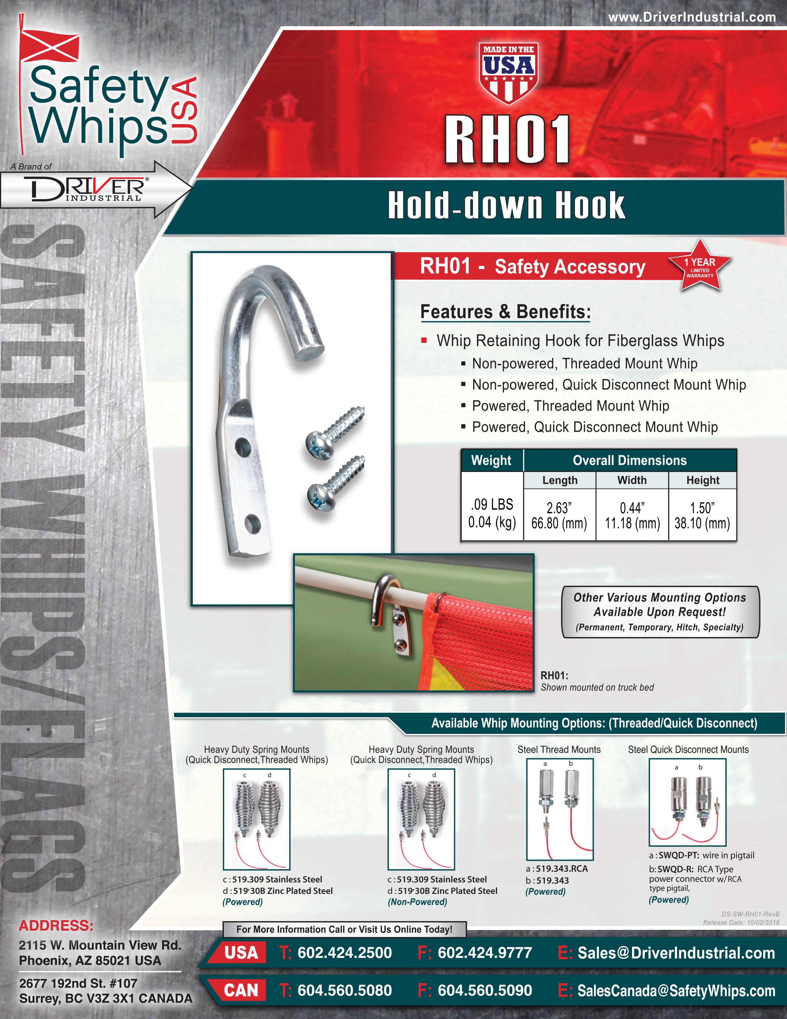 A Whip Retaining hook will attach to your vehicle and allow you to secure your whip to your vehicle; and is recommended for Super Duty and Heavy Duty whips 8′ with with a spring for bending it down to secure to whip retaining hook which is attached in a location on your vehicle.