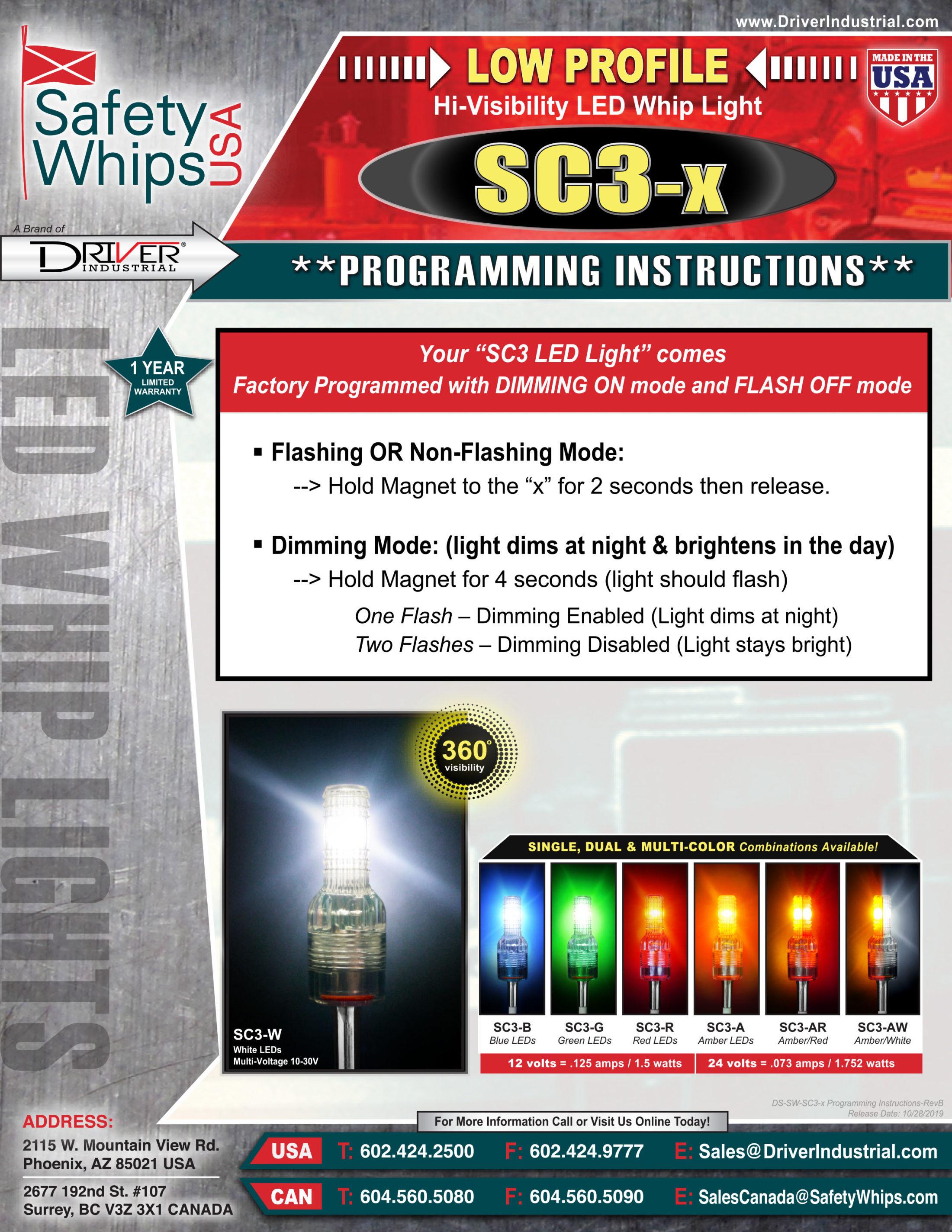 SafetyWhips® new Lock & Seal SC3 with a Low Profile Lens incorporates a quality LED Light and is available in Single Color, Dual Color or Multi-Color (RGB) options and offers some additional features from the SC4 such as Programmable Photo Sensor to stabilize night time visibility and a 10-30Vdc capability.