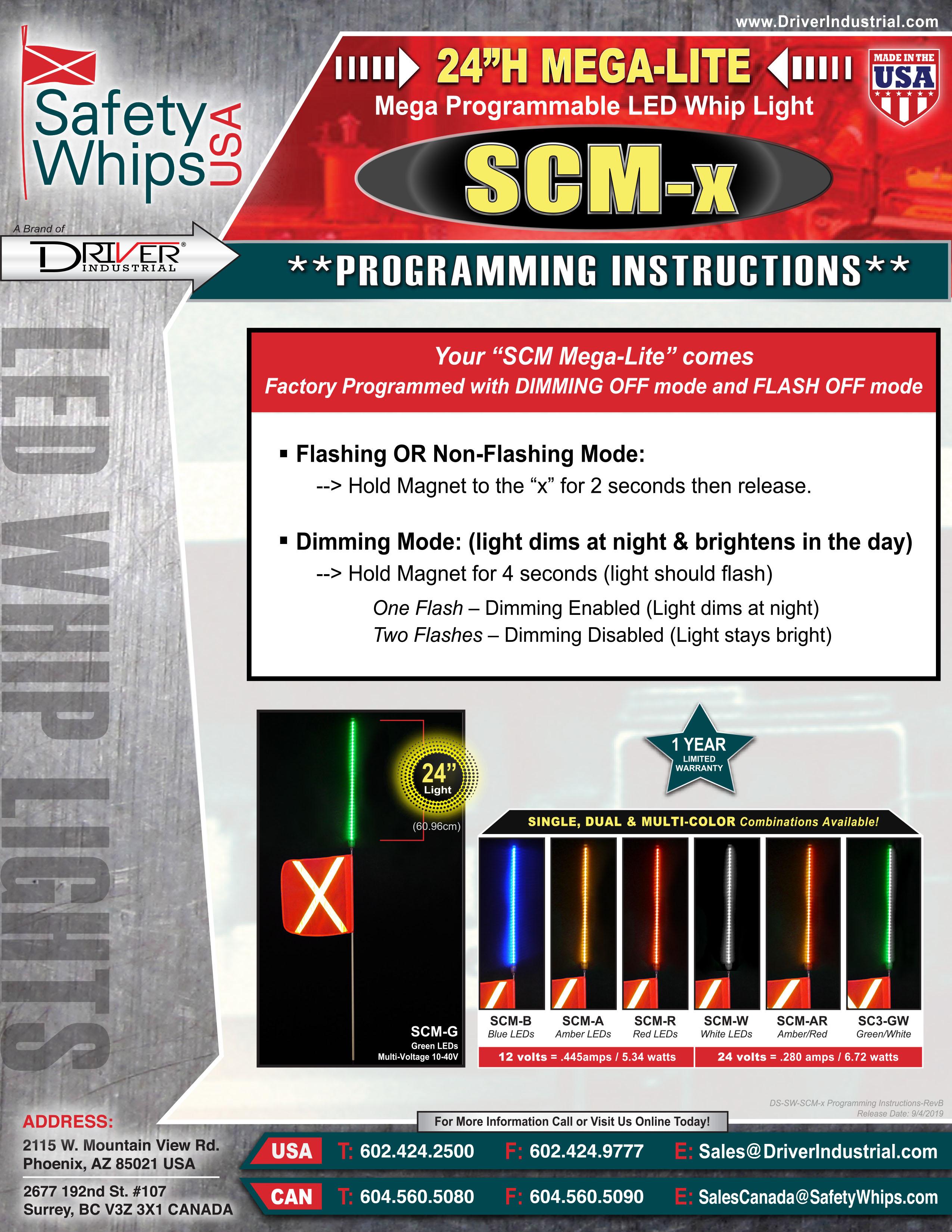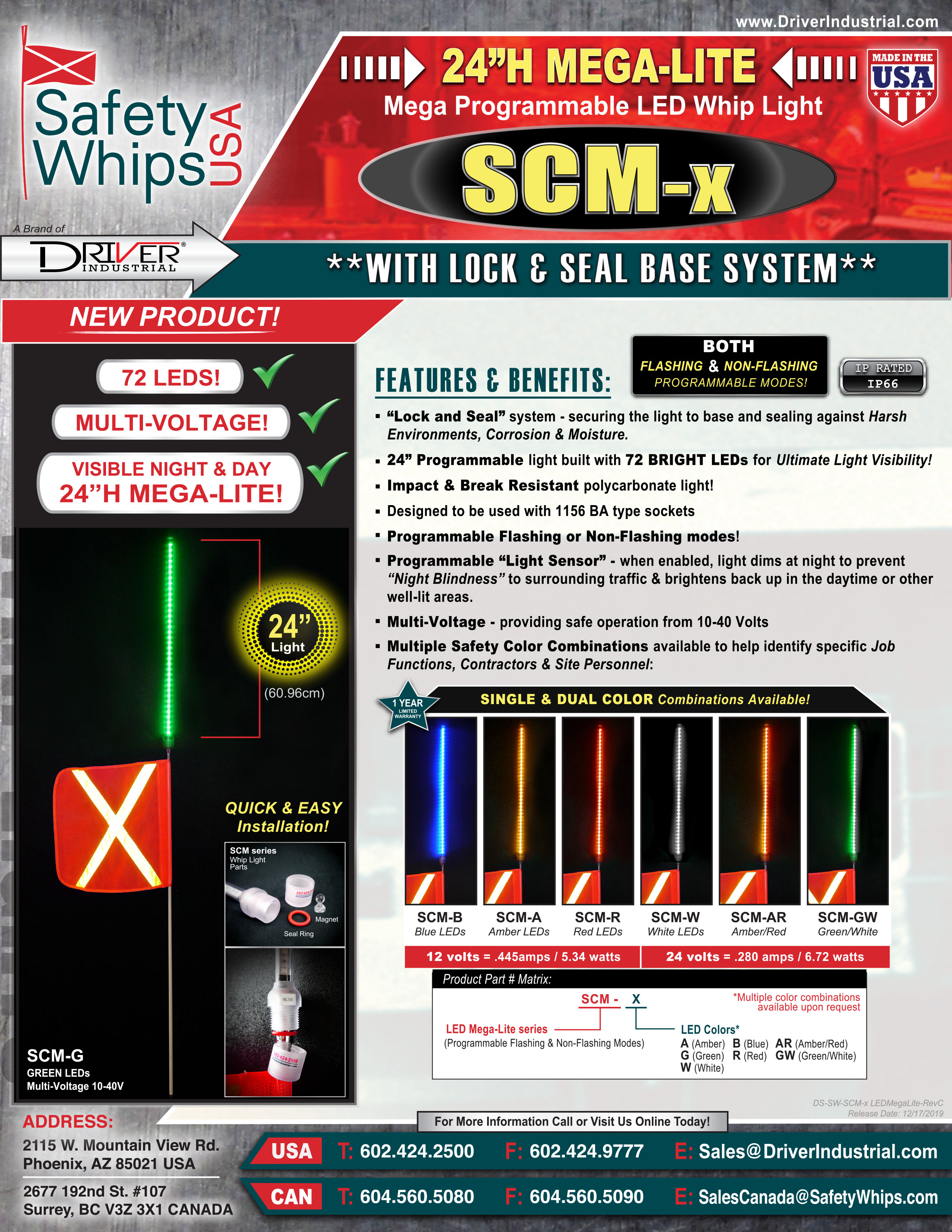 SafetyWhips® new Lock & Seal SCM The 24 MegaLite – incorporates an extra large 24″ LED whip light which has 72 LEDs and are available in Single Color & Dual Color options, visible both day and & night, 10-40Vdc capability.