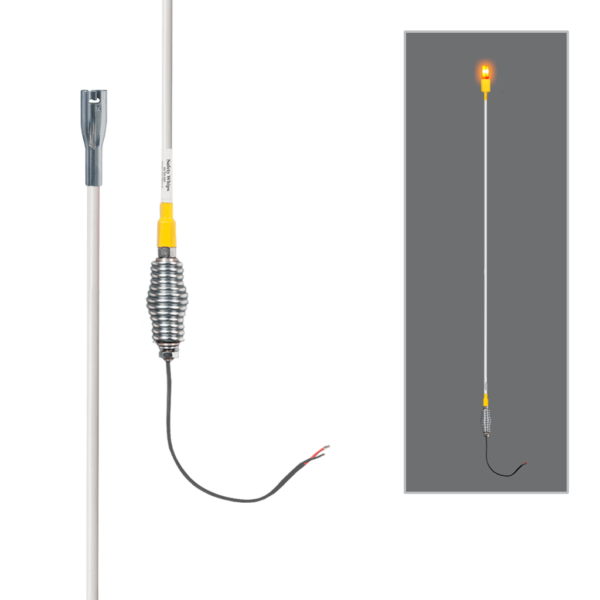Safe & non-conductive, All-Weather Super Duty Fiberglass Whips built to handle the most extreme environmental conditions that your vehicle & equipment may endure. Super Duty SafetyWhips® have a continuous power cable which runs continuously thru LED light and hex base and extends 18″. This helps to eliminate connection failures due to corrosion or the entrance of contaminants into your fittings; as well as remove the chances of having any conceivable breaks in the internal wires. These whips also have added locked-in shielding components, top and bottom sealed against harsh environments, corrosion & moisture for increased durability. This product is offered in Complete Whip Assemblies and as well as optional customization for your needs. Standard whip lengths available from 1ft (1.52m) up to 12ft (3.66m) with various Accessory options available: Safety Flags, Mounts, LED Whip Lights.