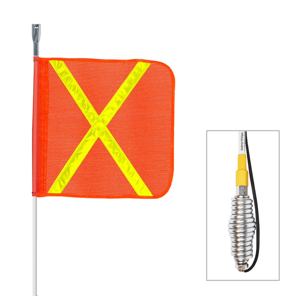 5' Super Duty, All Weather Fiberglass Warning Whip. This whip includes an Orange Mesh 16" x 16" flag with a Yellow Reflective ''X''. Also built with a Stainless Steel Heavy Duty Barrel Spring base to add life and flexibility to your whip. Complete this whip with a premium weatherproof LED light. This Amber (A) LED Light has a Lock and Seal system with multivoltage (10-40 Volts) and is a High Profile Bright 6 LED Light that is Non-flashing, steady on for great visibility.