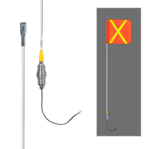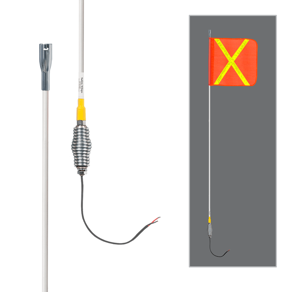 Safe & non-conductive, All-Weather Super Duty Fiberglass Whips built to handle the most extreme environmental conditions that your vehicle & equipment may endure. Super Duty SafetyWhips® have a continuous power cable which runs continuously thru LED light and hex base and extends 18″. This helps to eliminate connection failures due to corrosion or the entrance of contaminants into your fittings; as well as remove the chances of having any conceivable breaks in the internal wires. These whips also have added locked-in shielding components, top and bottom sealed against harsh environments, corrosion & moisture for increased durability. This product is offered in Complete Whip Assemblies and as well as optional customization for your needs. Standard whip lengths available from 1ft (1.52m) up to 12ft (3.66m) with various Accessory options available: Safety Flags, Mounts, LED Whip Lights.