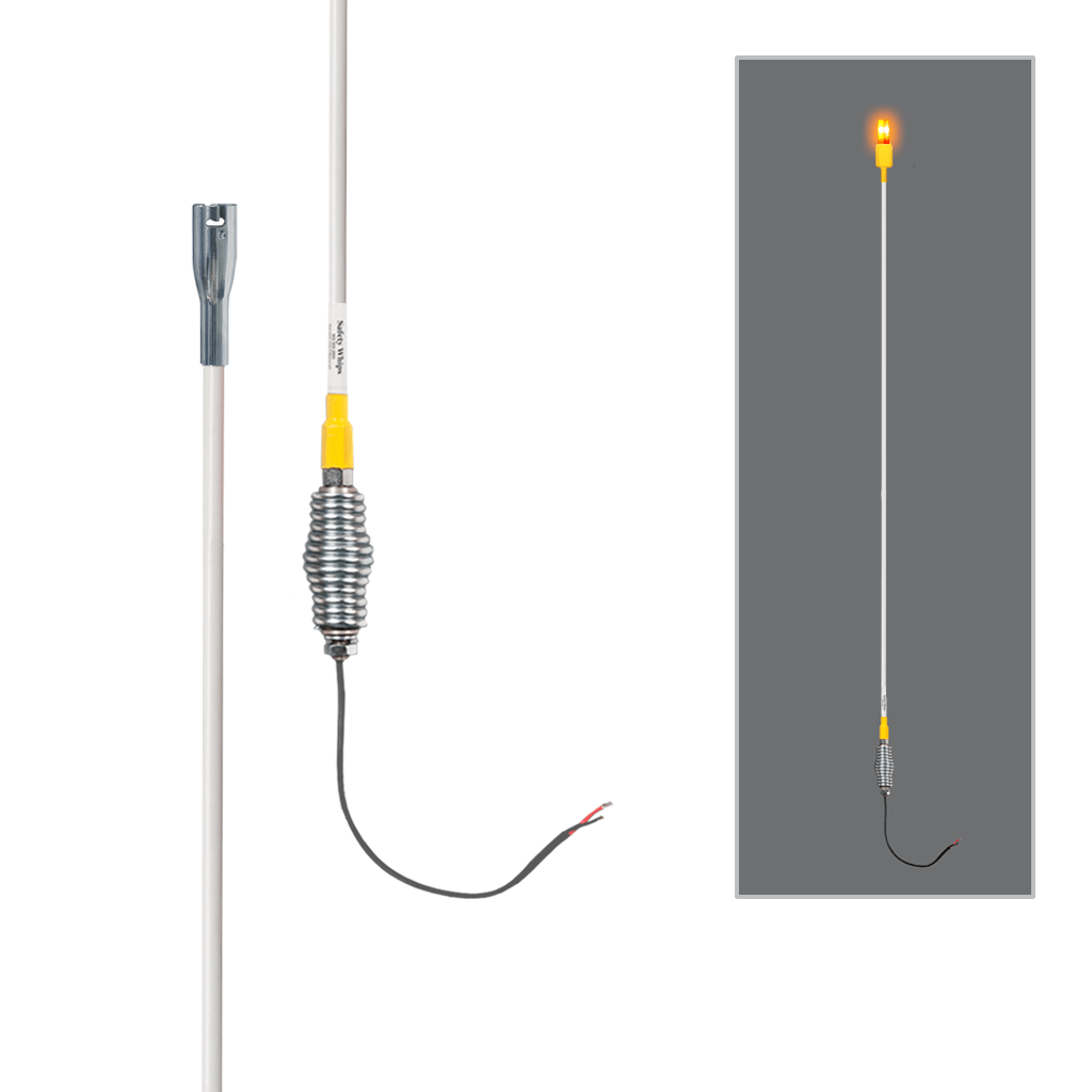 Safe & non-conductive, All-Weather Super Duty Fiberglass Whips built to handle the most extreme environmental conditions that your vehicle & equipment may endure. Super Duty SafetyWhips® have a continuous power cable which runs continuously thru LED light and hex base and extends 18″. This helps to eliminate connection failures due to corrosion or the entrance of contaminants into your fittings; as well as remove the chances of having any conceivable breaks in the internal wires. These whips also have added locked-in shielding components, top and bottom sealed against harsh environments, corrosion & moisture for increased durability. This product is offered in Complete Whip Assemblies and as well as optional customization for your needs. Standard whip lengths available from 1ft (1.52m) up to 12ft (3.66m) with various Accessory options available: Safety Flags, Mounts, LED Whip Lights.