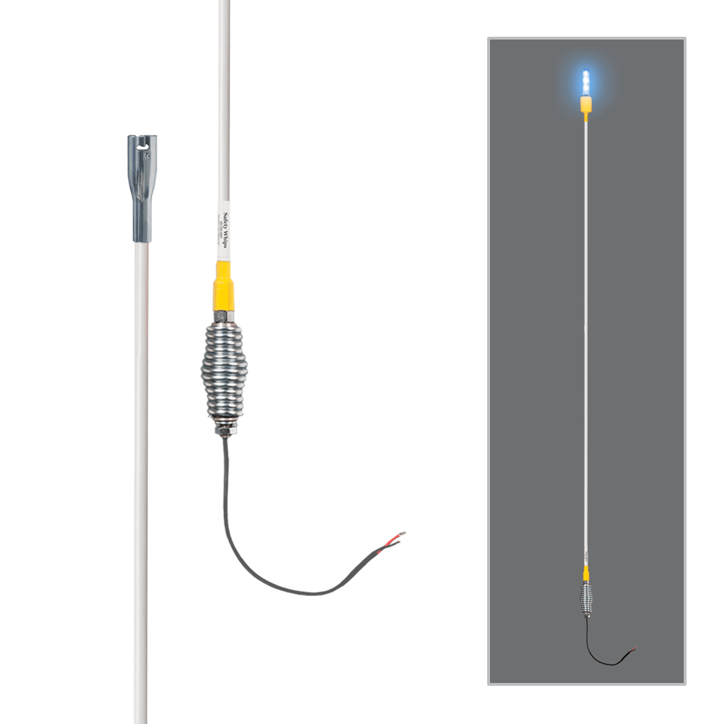 Safe & non-conductive, All-Weather Super Duty Fiberglass Whips built to handle the most extreme environmental conditions that your vehicle & equipment may endure. Super Duty SafetyWhips® have a continuous power cable which runs continuously thru LED light and hex base and extends 18″. This helps to eliminate connection failures due to corrosion or the entrance of contaminants into your fittings; as well as remove the chances of having any conceivable breaks in the internal wires. These whips also have added locked-in shielding components, top and bottom sealed against harsh environments, corrosion & moisture for increased durability. This product is offered in Complete Whip Assemblies and as well as optional customization for your needs. Standard whip lengths available from 1ft (1.52m) up to 12ft (3.66m) with various Accessory options available: Safety Flags, Mounts, LED Whip Lights.