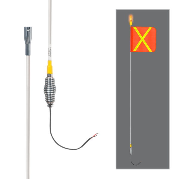 Safe & non-conductive, All-Weather Super Duty Fiberglass Whips built to handle the most extreme environmental conditions that your vehicle & equipment may endure. Super Duty SafetyWhips® have a continuous power cable which runs continuously thru LED light and hex base and extends 18″. This helps to eliminate connection failures due to corrosion or the entrance of contaminants into your fittings; as well as remove the chances of having any conceivable breaks in the internal wires. These whips also have added locked-in shielding components, top and bottom sealed against harsh environments, corrosion & moisture for increased durability. This product is offered in Complete Whip Assemblies and as well as optional customization for your needs. Standard whip lengths available from 1ft (1.52m) up to 12ft (3.66m) with various Accessory options available: Safety Flags, Mounts, LED Whip Lights.