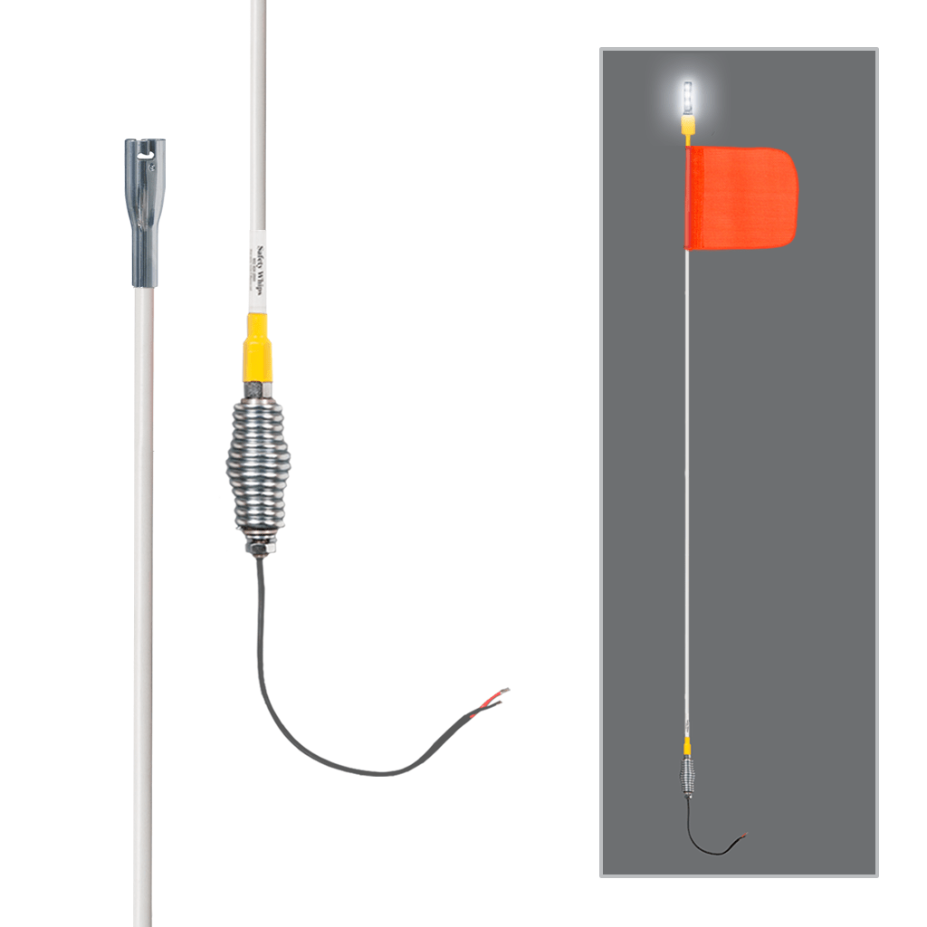 Safe & non-conductive, All-Weather Super Duty Fiberglass Whips built to handle the most extreme environmental conditions that your vehicle & equipment may endure. Super Duty SafetyWhips® have a continuous power cable which runs continuously thru LED light and hex base and extends 18″. This helps to eliminate connection failures due to corrosion or the entrance of contaminants into your fittings; as well as remove the chances of having any conceivable breaks in the internal wires. These whips also have added locked-in shielding components, top and bottom sealed against harsh environments, corrosion & moisture for increased durability. This product is offered in Complete Whip Assemblies and as well as optional customization for your needs. Standard whip lengths available from 1ft (1.52m) up to 12ft (3.66m) with various Accessory options available: Safety Flags, Mounts, LED Whip Lights.