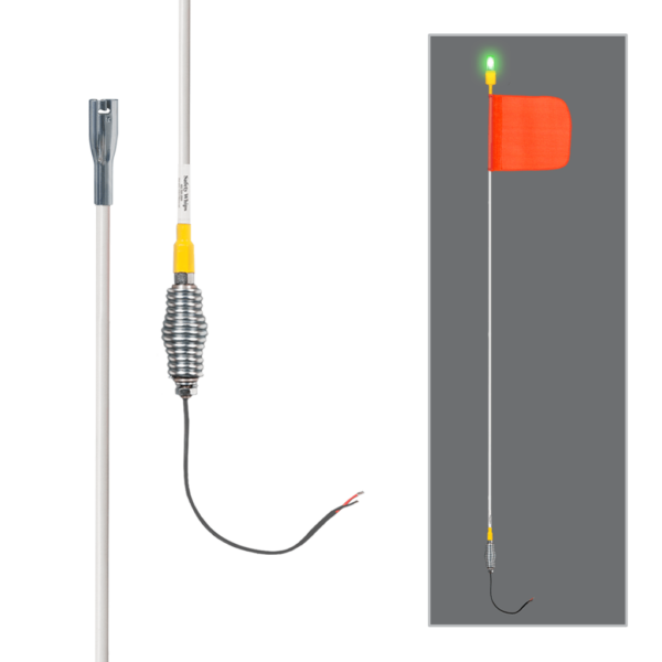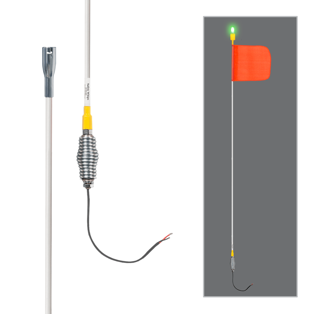 Safe & non-conductive, All-Weather Super Duty Fiberglass Whips built to handle the most extreme environmental conditions that your vehicle & equipment may endure. Super Duty SafetyWhips® have a continuous power cable which runs continuously thru LED light and hex base and extends 18″. This helps to eliminate connection failures due to corrosion or the entrance of contaminants into your fittings; as well as remove the chances of having any conceivable breaks in the internal wires. These whips also have added locked-in shielding components, top and bottom sealed against harsh environments, corrosion & moisture for increased durability. This product is offered in Complete Whip Assemblies and as well as optional customization for your needs. Standard whip lengths available from 1ft (1.52m) up to 12ft (3.66m) with various Accessory options available: Safety Flags, Mounts, LED Whip Lights.