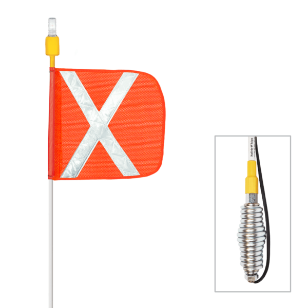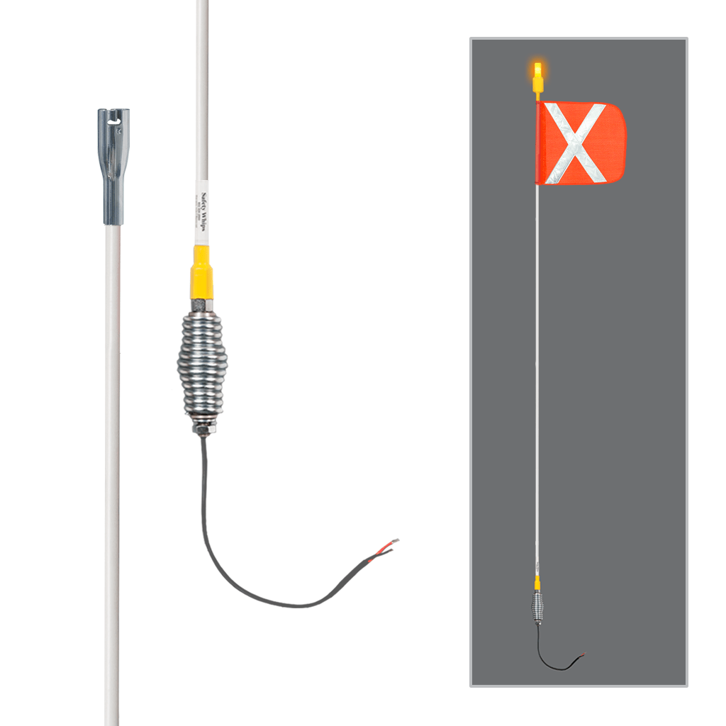 8' Super Duty, All Weather Fiberglass Warning Whip. This whip includes an Orange Mesh 11.5" x 11.5" flag with a White Reflective ''X''. Also built with a Zinc Plated Heavy Duty Barrel Spring base to add life and flexibility to your whip. Complete this whip with a premium weatherproof LED light. This Amber (A) LED Light has a Lock and Seal system with multi-voltage (10-40 Volts) and is a Low Profile Super Bright 2 LED Light that is Flashing and Non-flashing selectable with a magnet.