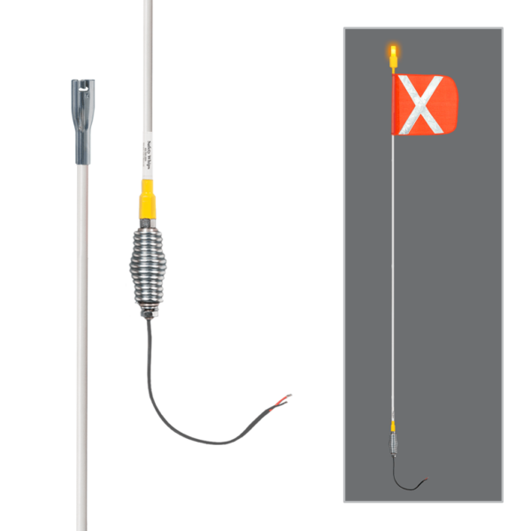 Safe & non-conductive, All-Weather Super Duty Fiberglass Whips built to handle the most extreme environmental conditions that your vehicle & equipment may endure. Super Duty SafetyWhips® have a continuous power cable which runs continuously thru LED light and hex base and extends 18”. This helps to eliminate connection failures due to corrosion or the entrance of contaminants into your fittings; as well as remove the chances of having any conceivable breaks in the internal wires. These whips also have added “locked-in” shielding components, top and bottom seaLED against harsh environments, corrosion & moisture for increased durability. This product is offered in Complete Whip Assemblies and as well as optional customization for your needs. Standard whip lengths available from 1ft (1.52m) up to 12ft (3.66m) with various Accessory options available: Safety Flags, Mounts, LED Whip Lights.