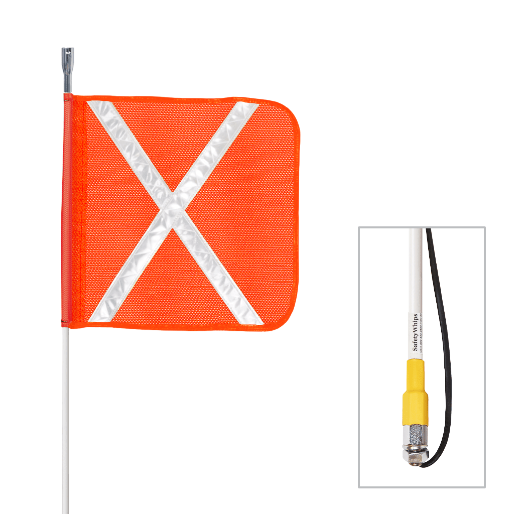 8' Super Duty, All Weather Fiberglass Warning Whip. This whip includes an Orange Mesh 16" x 16" flag with a Yellow Reflective ''X''. Complete this whip with a premium weatherproof LED light. This Amber/Red (AR) LED Light has a Lock and Seal system with multi-voltage (10-40 Volts) and is a High Profile Bright 6 LED Light that is Non-flashing, steady on for great visibility.