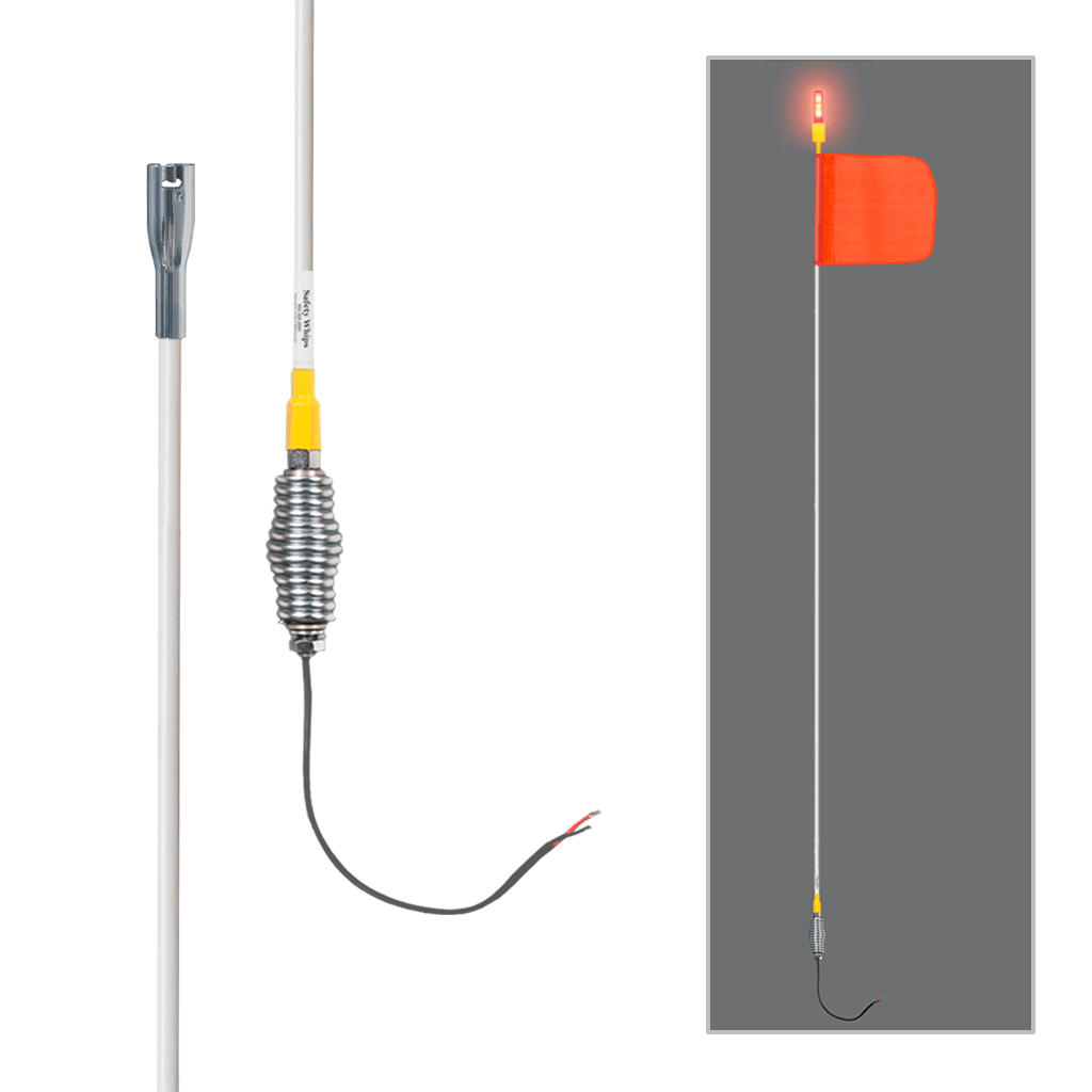 Safe & non-conductive, All-Weather Super Duty Fiberglass Whips built to handle the most extreme environmental conditions that your vehicle & equipment may endure. Super Duty SafetyWhips® have a continuous power cable which runs continuously thru LED light and hex base and extends 18. This helps to eliminate connection failures due to corrosion or the entrance of contaminants into your fittings; as well as remove the chances of having any conceivable breaks in the internal wires. These whips also have added locked-in shielding components, top and bottom seaLED against harsh environments, corrosion & moisture for increased durability. This product is offered in Complete Whip Assemblies and as well as optional customization for your needs. Standard whip lengths available from 1ft (1.52m) up to 12ft (3.66m) with various Accessory options available: Safety Flags, Mounts, LED Whip Lights.