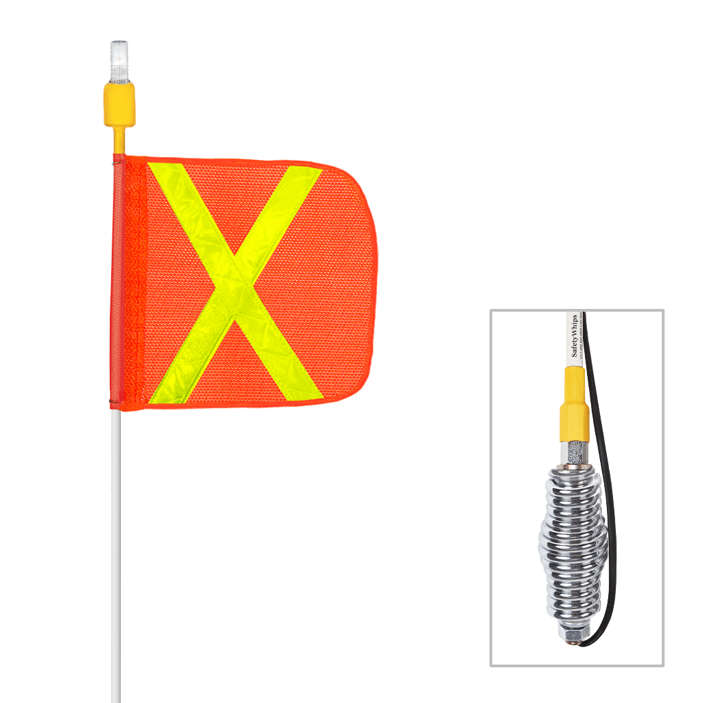10' Super Duty, All Weather Fiberglass Warning Whip. This whip includes an Orange Mesh 11.5" x 11.5" flag. Also built with a Zinc Plated Heavy Duty Barrel Spring base to add life and flexibility to your whip. Complete this whip with a premium weatherproof LED light. This Red (R) LED Light has a Lock and Seal system with multi-voltage (10-40 Volts) and is a High Profile Bright 6 LED Light that flashes for best visibility.