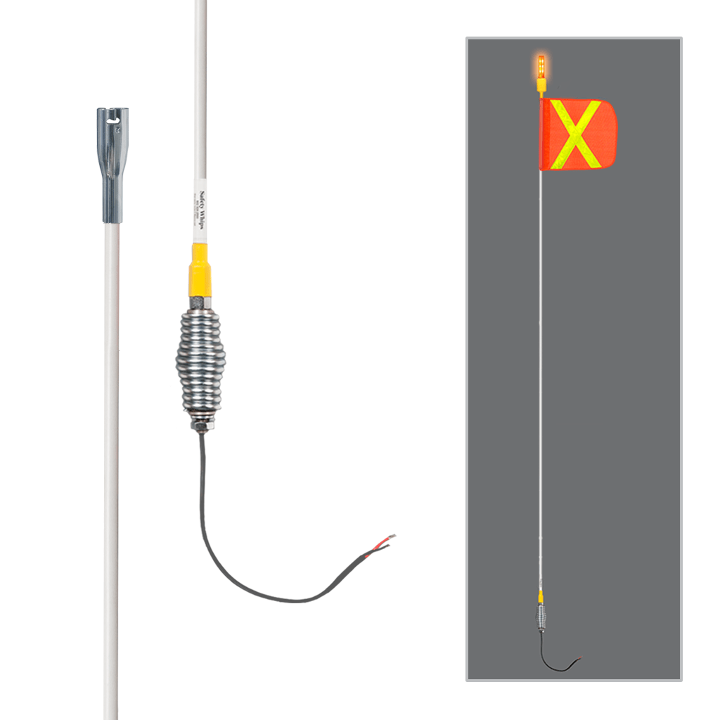 Safe & non-conductive, All-Weather Super Duty Fiberglass Whips built to handle the most extreme environmental conditions that your vehicle & equipment may endure. Super Duty SafetyWhips® have a continuous power cable which runs continuously thru LED light and hex base and extends 18. This helps to eliminate connection failures due to corrosion or the entrance of contaminants into your fittings; as well as remove the chances of having any conceivable breaks in the internal wires. These whips also have added locked-in shielding components, top and bottom seaLED against harsh environments, corrosion & moisture for increased durability. This product is offered in Complete Whip Assemblies and as well as optional customization for your needs. Standard whip lengths available from 1ft (1.52m) up to 12ft (3.66m) with various Accessory options available: Safety Flags, Mounts, LED Whip Lights.