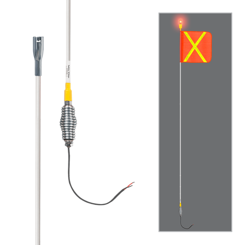 Safe & non-conductive, All-Weather Super Duty Fiberglass Whips built to handle the most extreme environmental conditions that your vehicle & equipment may endure. Super Duty SafetyWhips® have a continuous power cable which runs continuously thru LED light and hex base and extends 18. This helps to eliminate connection failures due to corrosion or the entrance of contaminants into your fittings; as well as remove the chances of having any conceivable breaks in the internal wires. These whips also have added locked-in shielding components, top and bottom seaLED against harsh environments, corrosion & moisture for increased durability. This product is offered in Complete Whip Assemblies and as well as optional customization for your needs. Standard whip lengths available from 1ft (1.52m) up to 12ft (3.66m) with various Accessory options available: Safety Flags, Mounts, LED Whip Lights.