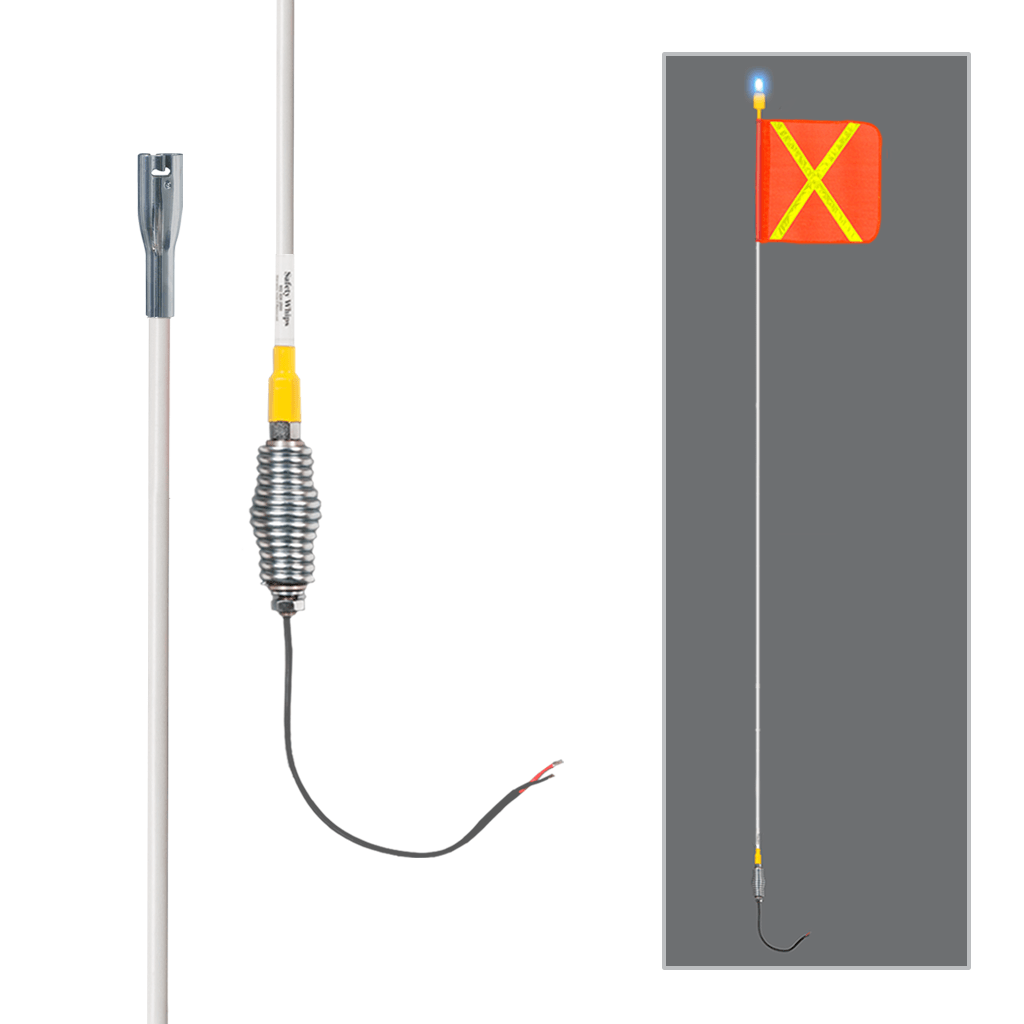 Safe & non-conductive, All-Weather Super Duty Fiberglass Whips built to handle the most extreme environmental conditions that your vehicle & equipment may endure. Super Duty SafetyWhips® have a continuous power cable which runs continuously thru LED light and hex base and extends 18″. This helps to eliminate connection failures due to corrosion or the entrance of contaminants into your fittings; as well as remove the chances of having any conceivable breaks in the internal wires. These whips also have added locked-in shielding components, top and bottom seaLED against harsh environments, corrosion & moisture for increased durability. This product is offered in Complete Whip Assemblies and as well as optional customization for your needs. Standard whip lengths available from 1ft (1.52m) up to 12ft (3.66m) with various Accessory options available: Safety Flags, Mounts, LED Whip Lights.
