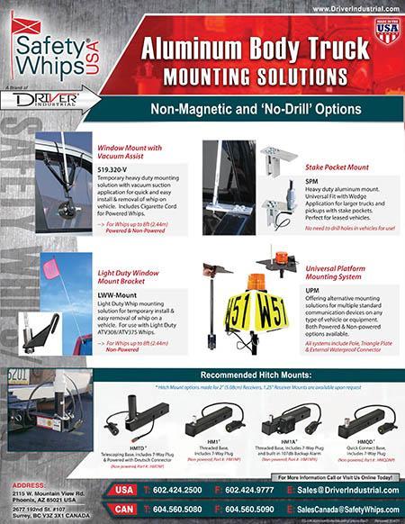 Mounting accessories make your whip experience easier, faster, or a more durable whip. Our current mounts include transition to a Threaded Hex Base, Quick Disconnect Base and a Lock Pin Base* (*telescoping whip). We offer a variety of mounting accessories to work with each of these base types dependent on whether the client prefers permanent or temporary installation and whether the client wants to have a powered or non-powered whip. Our Quick Disconnect Mounts make your installation or removal of your whip more expedient with the ability to disconnect your whip and store it away for driving on a highway in a second versus screwing it off slowly every time you need to access a public main road, freeway or highway. Our spring mounts help to protect your whip from jars and jolts from equipment and rough terrain. Our hitch mount options offer non-permanent whip install; we also have extended hitch mounts which enable the end user use of tailgate or truck bed access. SafetyWhips® offers several varieties of magnetic mount options for temporary mount options which include a Light Duty magnet, and Medium Duty Magnet, and a Heavy Duty Magnets utilizing a cigarette cord adaptor for powered options. The size of the magnetic mount you choose depends on the length of your whip, vehicle speed during use of magnetic whip, and overall weight of your whip. We have you in mind and regularly protected when we decided to offer various mounts for permanent installation on a variety of vehicles and equipment whether it be in the truck or vehicle bed or roof, on the side of a van or equipment such as several angle bracket mounts, several types of flat surface mounts, a side wall mount, and a fold down mount.