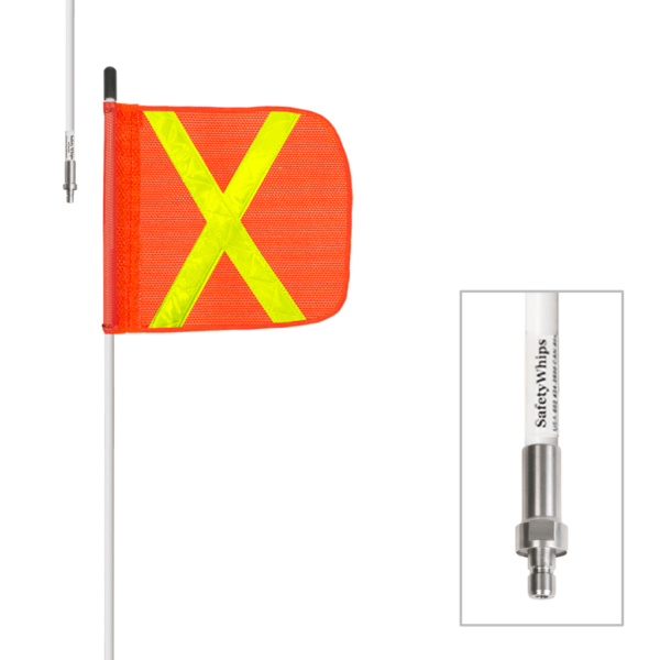 3' Heavy Duty, All Weather Fiberglass Warning Whip. 1/2" Whip Diameter. This 1 Piece Non-Powered whip and has a Quick Disconnect base on the bottom. This whip includes an Orange Mesh 11.5" x 11.5" flag with a Yellow Reflective ''X''.
