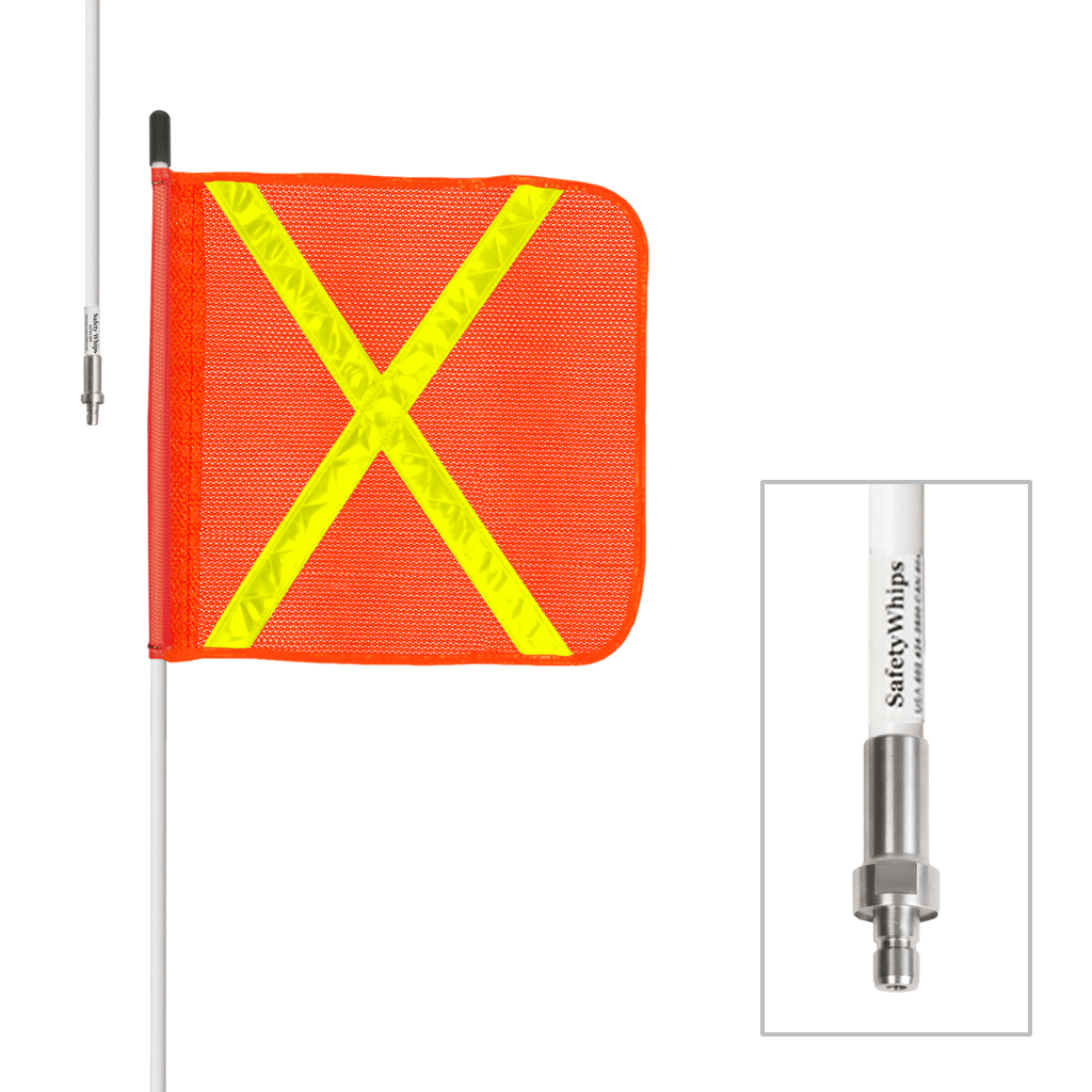 4' Heavy Duty, All Weather Fiberglass Warning Whip. 1/2" Whip Diameter. This 1 Piece Powered whip has an 1156 Type Light Socket on top and has a Quick Disconnect base on the bottom. This whip includes an Orange Mesh 16" x 16" flag with a Yellow Reflective ''X''.