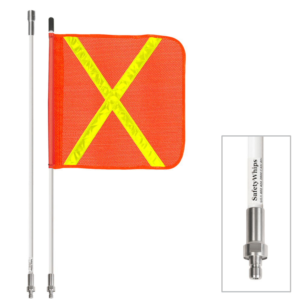 Heavy Duty SafetyWhips® Whip Lengths available are from 3ft (0.91m) up to 12ft (3.66m) with whip extensions from 1ft (.30m) to 6ft (1.83m); with custom lengths available upon request. Our Standard Whip Lengths in stock are 3″, 4″, 5″, 6″, 8″, 10″, 12″ lengths. You have your choice of lighting options, mounting accessories, heavy duty flags made of our high-quality Super Visibility nylon mesh flag made with or without 3M ® Scotchlite ® Reflective X, as well as an optional heavy duty spring mounting base. SafetyWhips® has the largest assortment of options for your base, mount, spring, flag and lighting of your whip. Heavy Duty SafetyWhips® are well known for their quick, convenient and beneficial add-on options such as the Quick Disconnect to easily disconnect from your vehicle for quick removal & convenient stow-a-way; the split pole or 2 piece break down options for convenient stow-a-way in tool boxes or small vehicle compartments; or adding an add-on extension to add additional length as needed. Make sure to check that you have selected any of these add-on optional products you wish to build your whip in your cart.