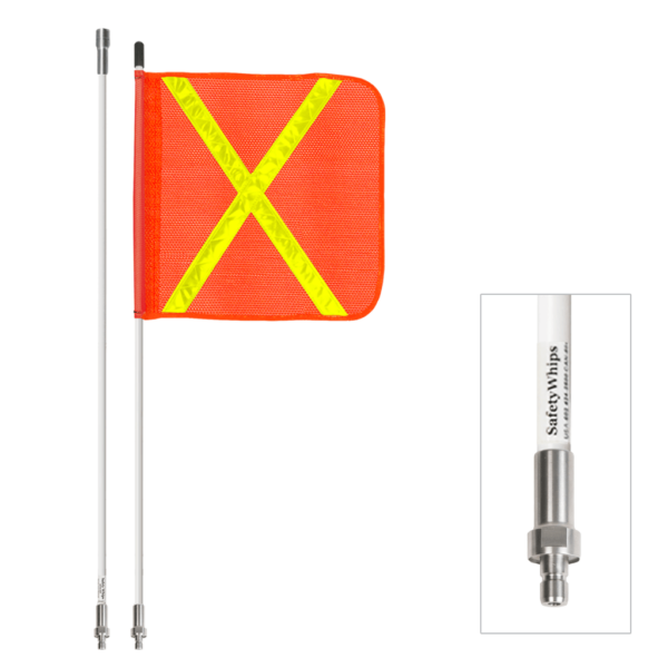 Heavy Duty SafetyWhips® Whip Lengths available are from 3ft (0.91m) up to 12ft (3.66m) with whip extensions from 1ft (.30m) to 6ft (1.83m); with custom lengths available upon request. Our Standard Whip Lengths in stock are 3″, 4″, 5″, 6″, 8″, 10″, 12″ lengths. You have your choice of lighting options, mounting accessories, heavy duty flags made of our high-quality Super Visibility nylon mesh flag made with or without 3M ® Scotchlite ® Reflective X, as well as an optional heavy duty spring mounting base. SafetyWhips® has the largest assortment of options for your base, mount, spring, flag and lighting of your whip. Heavy Duty SafetyWhips® are well known for their quick, convenient and beneficial add-on options such as the Quick Disconnect to easily disconnect from your vehicle for quick removal & convenient stow-a-way; the split pole or 2 piece break down options for convenient stow-a-way in tool boxes or small vehicle compartments; or adding an add-on extension to add additional length as needed. Make sure to check that you have selected any of these add-on optional products you wish to build your whip in your cart.