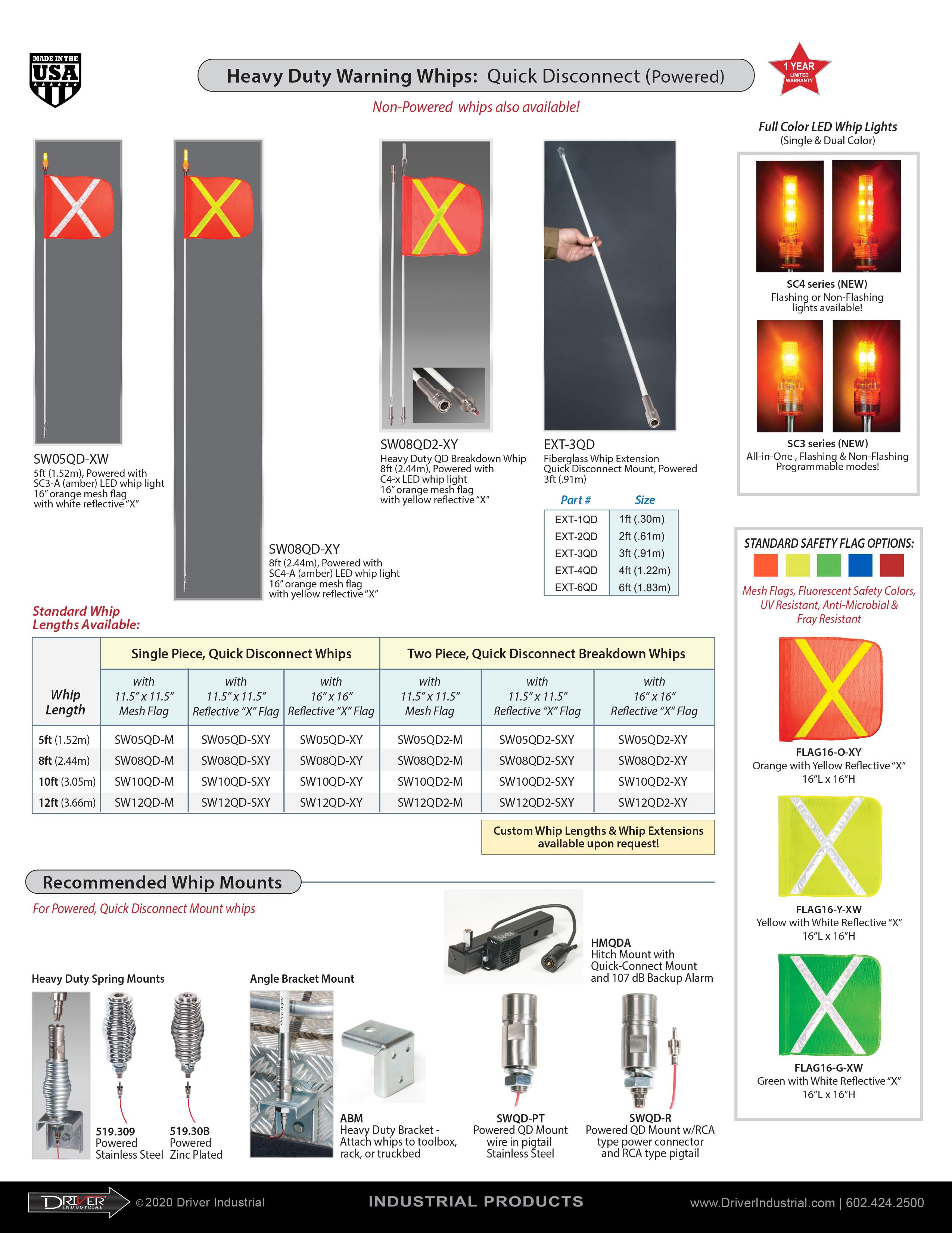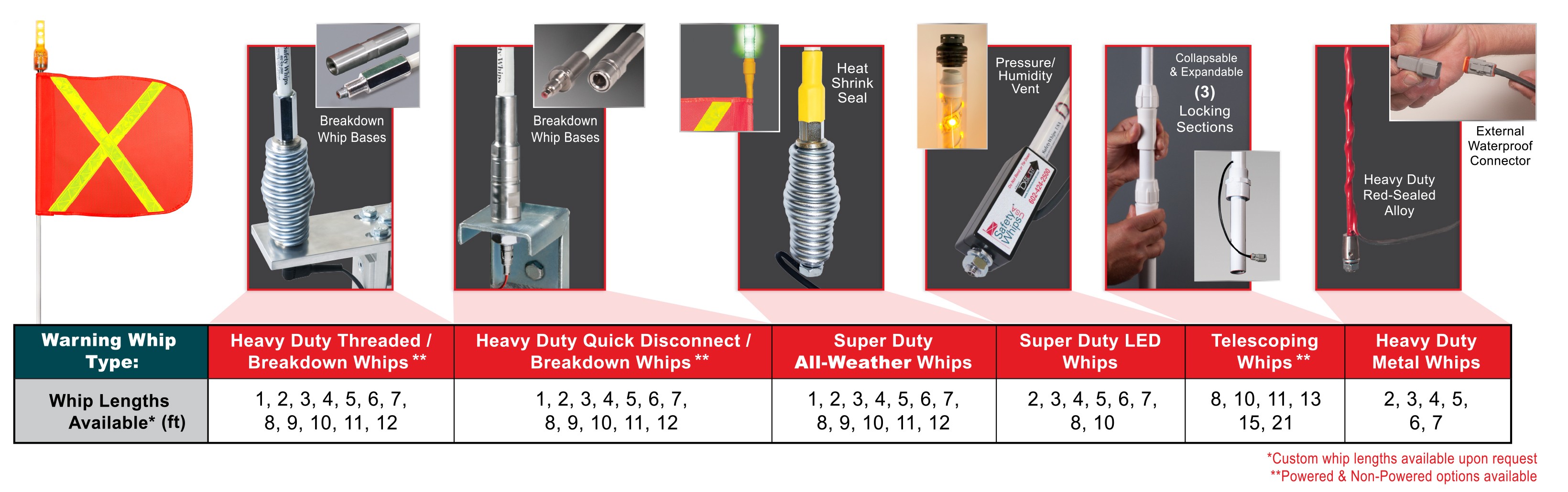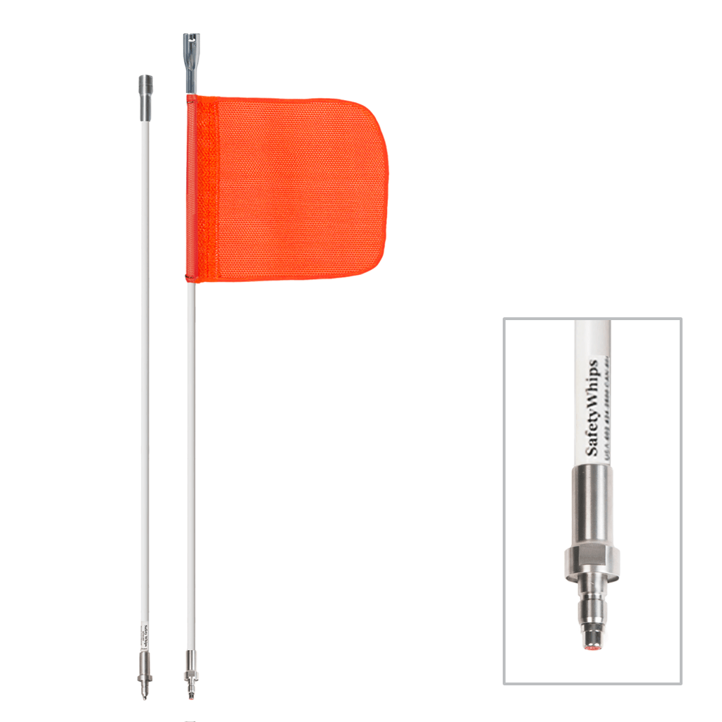 Heavy Duty SafetyWhips® Whip Lengths available are from 3ft (0.91m) up to 12ft (3.66m) with whip extensions from 1ft (.30m) to 6ft (1.83m); with custom lengths available upon request. Our Standard Whip Lengths in stock are 3″, 4″, 5″, 6″, 8″, 10″, 12″ lengths. You have your choice of lighting options, mounting accessories, heavy duty flags made of our high-quality Super Visibility nylon mesh flag made with or without 3M ® Scotchlite ® Reflective X, as well as an optional heavy duty spring mounting base. SafetyWhips® has the largest assortment of options for your base, mount, spring, flag and lighting of your whip. Heavy Duty SafetyWhips® are well known for their quick, convenient and beneficial add-on options such as the Quick Disconnect to easily disconnect from your vehicle for quick removal & convenient stow-a-way; the split pole or 2 piece break down options for convenient stow-a-way in tool boxes or small vehicle compartments; or adding an add-on extension to add additional length as needed. Make sure to check that you have selected any of these add-on optional products you wish to build your whip in your cart.