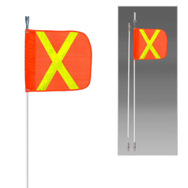 8' Heavy Duty, All Weather Fiberglass Warning Whip. 1/2" Whip Diameter. This 2 Piece (Breakdown) Powered whip has an 1156 Type Light Socket on top and has a Quick Disconnect base on the bottom. This whip includes an Orange Mesh 11.5" x 11.5" flag with a Yellow Reflective ''X''.