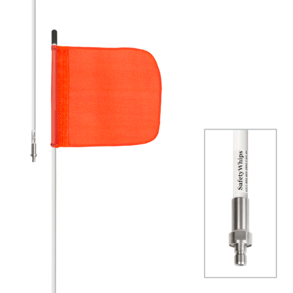 Heavy Duty SafetyWhips® Whip Lengths available are from 3ft (0.91m) up to 12ft (3.66m) with whip extensions from 1ft (.30m) to 6ft (1.83m); with custom lengths available upon request. Our Standard Whip Lengths in stock are 3″, 4″, 5″, 6″, 8″, 10″, 12″ lengths. You have your choice of lighting options, mounting accessories, heavy duty flags made of our high-quality Super Visibility™ nylon mesh flag made with or without 3M ® Scotchlite ® Reflective X, as well as an optional heavy duty spring mounting base. SafetyWhips® has the largest assortment of options for your base, mount, spring, flag and lighting of your whip. Heavy Duty SafetyWhips® are well known for their quick, convenient and beneficial add-on options such as the Quick Disconnect to easily disconnect from your vehicle for quick removal & convenient stow-a-way; the split pole or 2 piece break down options for convenient stow-a-way in tool boxes or small vehicle compartments; or adding an add-on extension to add additional length as needed. Make sure to check that you have selected any of these add-on optional products you wish to build your whip in your cart.