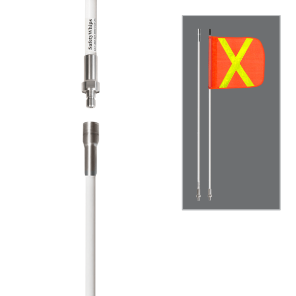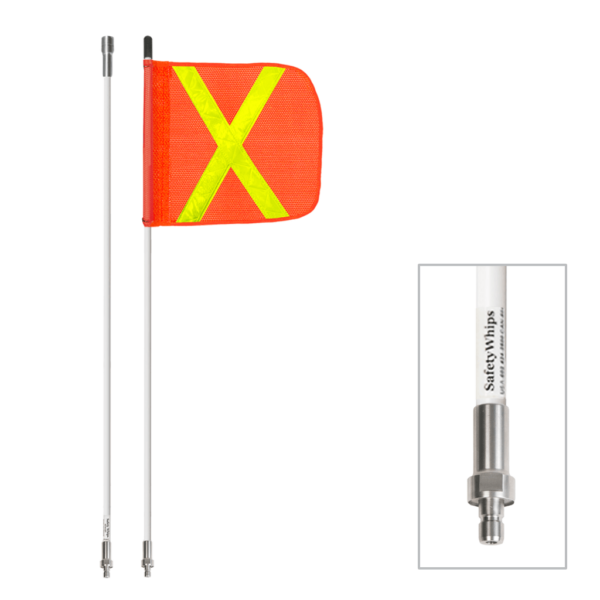 Heavy Duty SafetyWhips® Whip Lengths available are from 3ft (0.91m) up to 12ft (3.66m) with whip extensions from 1ft (.30m) to 6ft (1.83m); with custom lengths available upon request. Our Standard Whip Lengths in stock are 3″, 4″, 5″, 6″, 8″, 10″, 12″ lengths. You have your choice of lighting options, mounting accessories, heavy duty flags made of our high-quality Super Visibility nylon mesh flag made with or without 3M ® Scotchlite ® Reflective X, as well as an optional heavy duty spring mounting base. SafetyWhips® has the largest assortment of options for your base, mount, spring, flag and lighting of your whip. Heavy Duty SafetyWhips® are well known for their quick, convenient and beneficial add-on options such as the Quick Disconnect to easily disconnect from your vehicle for quick removal & convenient stow-a-way; the split pole or 2 piece break down options for convenient stow-a-way in tool boxes or small vehicle compartments; or adding an add-on extension to add additional length as needed. Make sure to check that you have selected any of these add-on optional products you wish to build your whip in your cart.