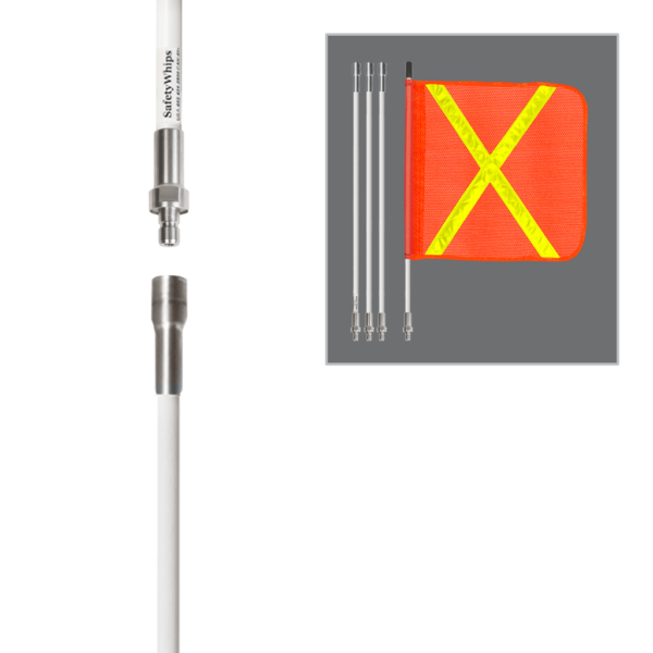 Heavy Duty SafetyWhips® Whip Lengths available are from 3ft (0.91m) up to 12ft (3.66m) with whip extensions from 1ft (.30m) to 6ft (1.83m); with custom lengths available upon request. Our Standard Whip Lengths in stock are 3″, 4″, 5″, 6″, 8″, 10″, 12″ lengths. You have your choice of lighting options, mounting accessories, heavy duty flags made of our high-quality Super Visibility nylon mesh flag made with or without 3M ® Scotchlite ® Reflective X, as well as an optional heavy duty spring mounting base. SafetyWhips® has the largest assortment of options for your base, mount, spring, flag and lighting of your whip. Heavy Duty SafetyWhips® are well known for their quick, convenient and beneficial add-on options such as the Quick Disconnect to easily disconnect from your vehicle for quick removal & convenient stow-a-way; the split pole or 2 piece break down options for convenient stow-a-way in tool boxes or small vehicle compartments; or adding an add-on extension to add additional length as needed. Make sure to check that you have selected any of these add-on optional products you wish to build your whip in your cart.