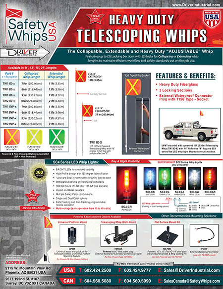 SafetyWhips® Telescoping whips are constructed of safe, non-conductive & adjustable Heavy Duty Fiberglass Whips for more Heavy Duty vehicle & equipment needs. Each whip contains 3 locking sections for adjusting heights. These 3 Sure-Lock collapsible and locking sections make it convenient for you to adjust your height of your whip as needed in any environment. Standard whip lengths available from 11ft (3.35m) up to 15ft (4.57m) with various Accessory options available to customize your whip: Safety Flags, Mounts, LED Whip Lights.