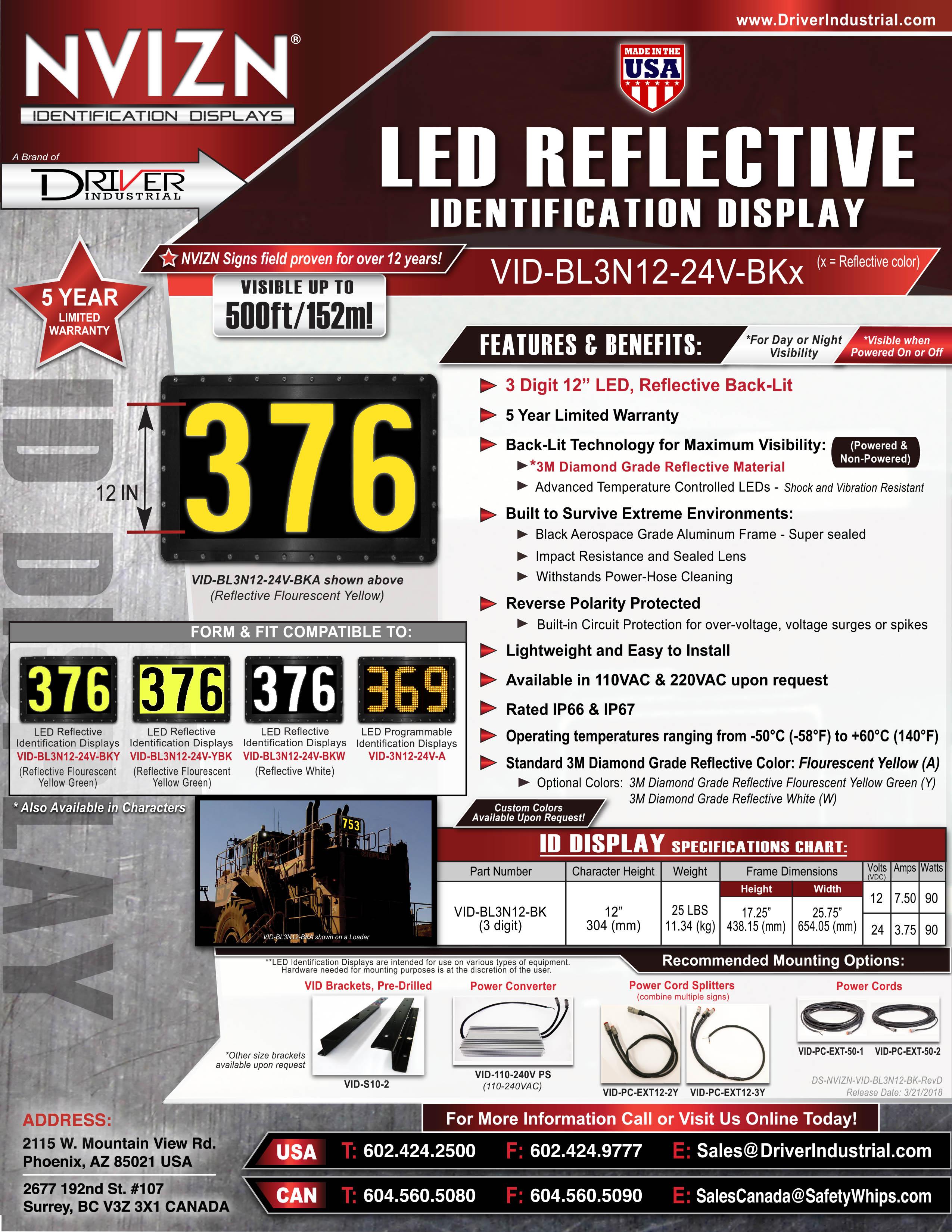 The LED Programmable NVIZN Identification Displays® options are the most efficient form of LED display. Recognized globally for dependability, high visibility and programmable functionality. Programmable displays provide the most robust and efficient way to identify vehicles and Heavy Equipment with Vehicle ID Numbers. NVIZN Identification Displays® are heavy duty fully functional displays available in 5 Types of Displays: Programmable LED, Messaging and Signaling, Reflective LED Backlit, 3-Sided Displays and Interchangeable LED Reflective Backlit and are available in various character sizes dependent on the type of display. Sizes for our different Types of Displays range from 9″, 12″, 18″, 24″, 36″, to 52″ dependent on display type. All Types of our NVIZN® Identification Displays are Mine-Tough and are built to survive the most extreme harsh environments; they are super sealed to be extremely durable to withstand power-hose cleaning, and are made of Hard Anodized Black Aerospace-Grade Aluminum framing and other lightweight materials making all of our products light weight and easy to install. NVIZN Identification Displays® have an Industry Leading 5 Year Limited Warranty.