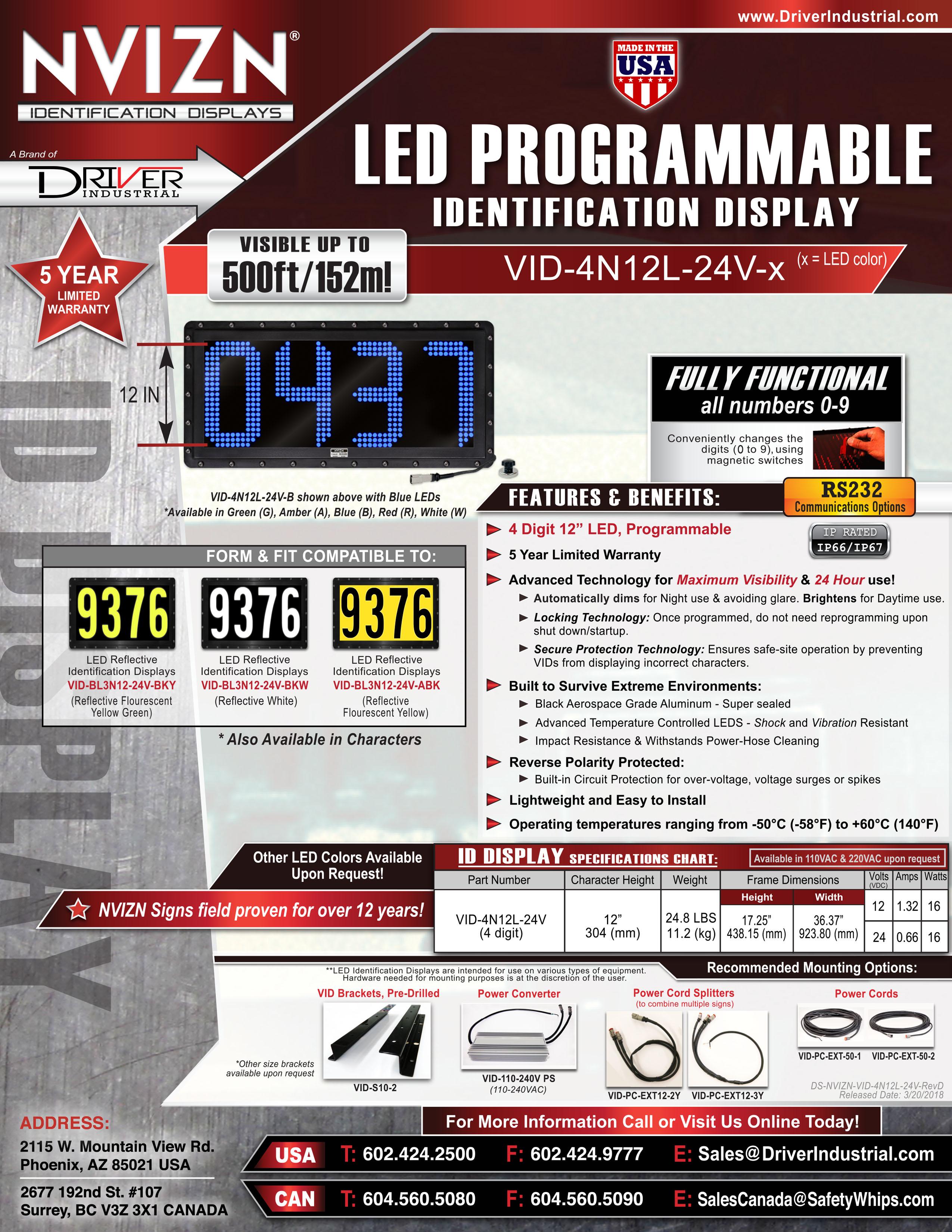 The LED Programmable NVIZN Identification Displays® options are the most efficient form of LED display. Recognized globally for dependability, high visibility and programmable functionality. Programmable displays provide the most robust and efficient way to identify vehicles and Heavy Equipment with Vehicle ID Numbers. NVIZN Identification Displays® are heavy duty fully functional displays available in 5 Types of Displays: Programmable LED, Messaging and Signaling, Reflective LED Backlit, 3-Sided Displays and Interchangeable LED Reflective Backlit and are available in various character sizes dependent on the type of display. Sizes for our different Types of Displays range from 9″, 12″, 18″, 24″, 36″, to 52″ dependent on display type. All Types of our NVIZN® Identification Displays are Mine-Tough and are built to survive the most extreme harsh environments; they are super sealed to be extremely durable to withstand power-hose cleaning, and are made of Hard Anodized Black Aerospace-Grade Aluminum framing and other lightweight materials making all of our products light weight and easy to install. NVIZN Identification Displays® have an Industry Leading 5 Year Limited Warranty.