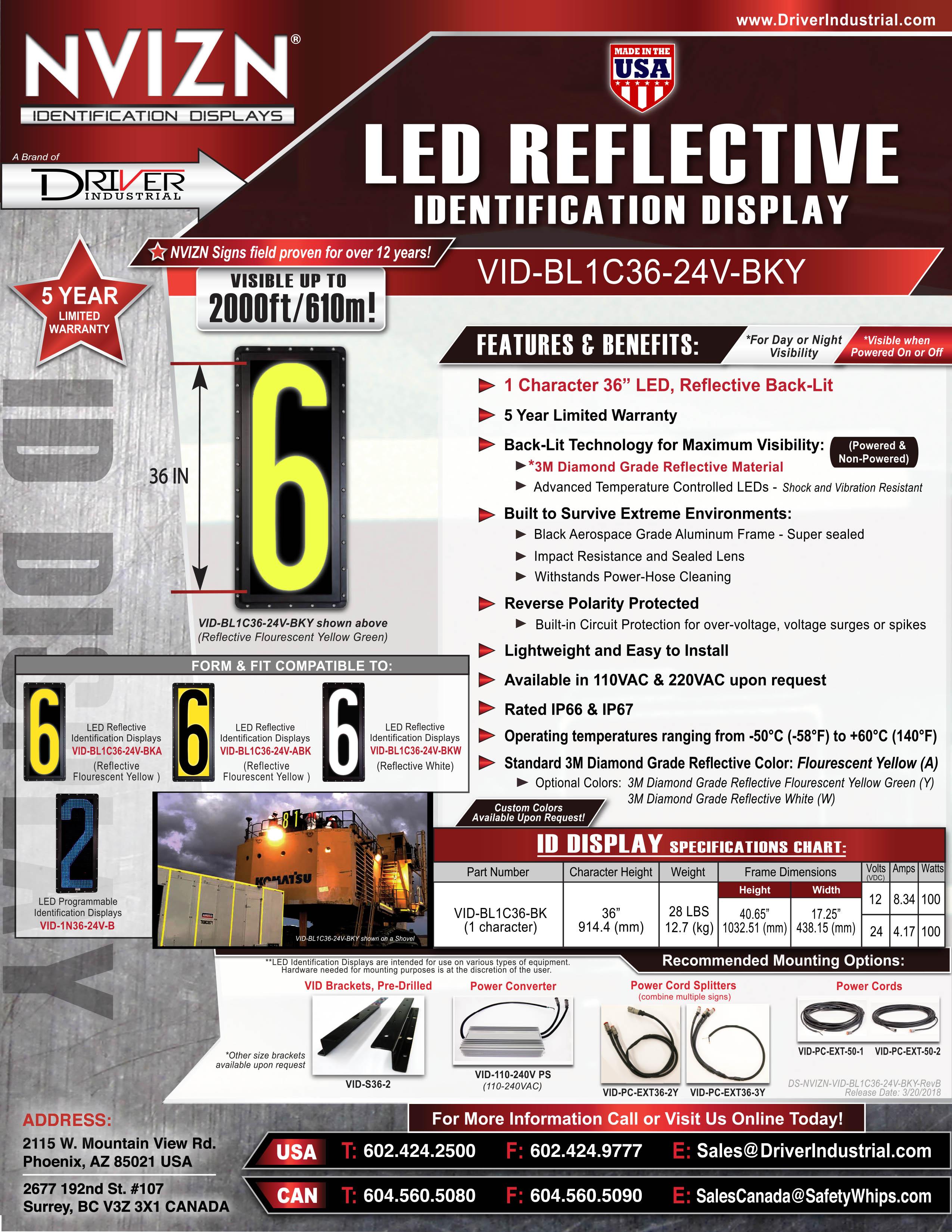NVIZN LED Programmable Identification Display options are the most efficient form of LED display. Recognized globally for dependability, high visibility, and programmable functionality. Programmable displays provide the most robust and efficient way to identify vehicles and Heavy Equipment with Vehicle ID Numbers. NVIZN Identification Displays® are heavy duty fully functional displays available in 5 Types of Displays: Programmable LED, Messaging and Signaling, Reflective LED Backlit, 3-Sided Displays and Interchangeable LED Reflective Backlit and are available in various character sizes dependent on the type of display. Sizes for our different Types of Displays range from 9″, 12″, 18″, 24″, 36″, to 52″. All Types of our NVIZN Identification Displays® are Mine-Tough and are built to survive the most extreme harsh environments; they are super sealed to be extremely durable to withstand power-hose cleaning, and are made of Hard Anodized Black Aerospace-Grade Aluminum framing and other lightweight materials making all of our products light weight and easy to install. NVIZN Identification Displays® have an Industry Leading 5 Year Limited Warranty.