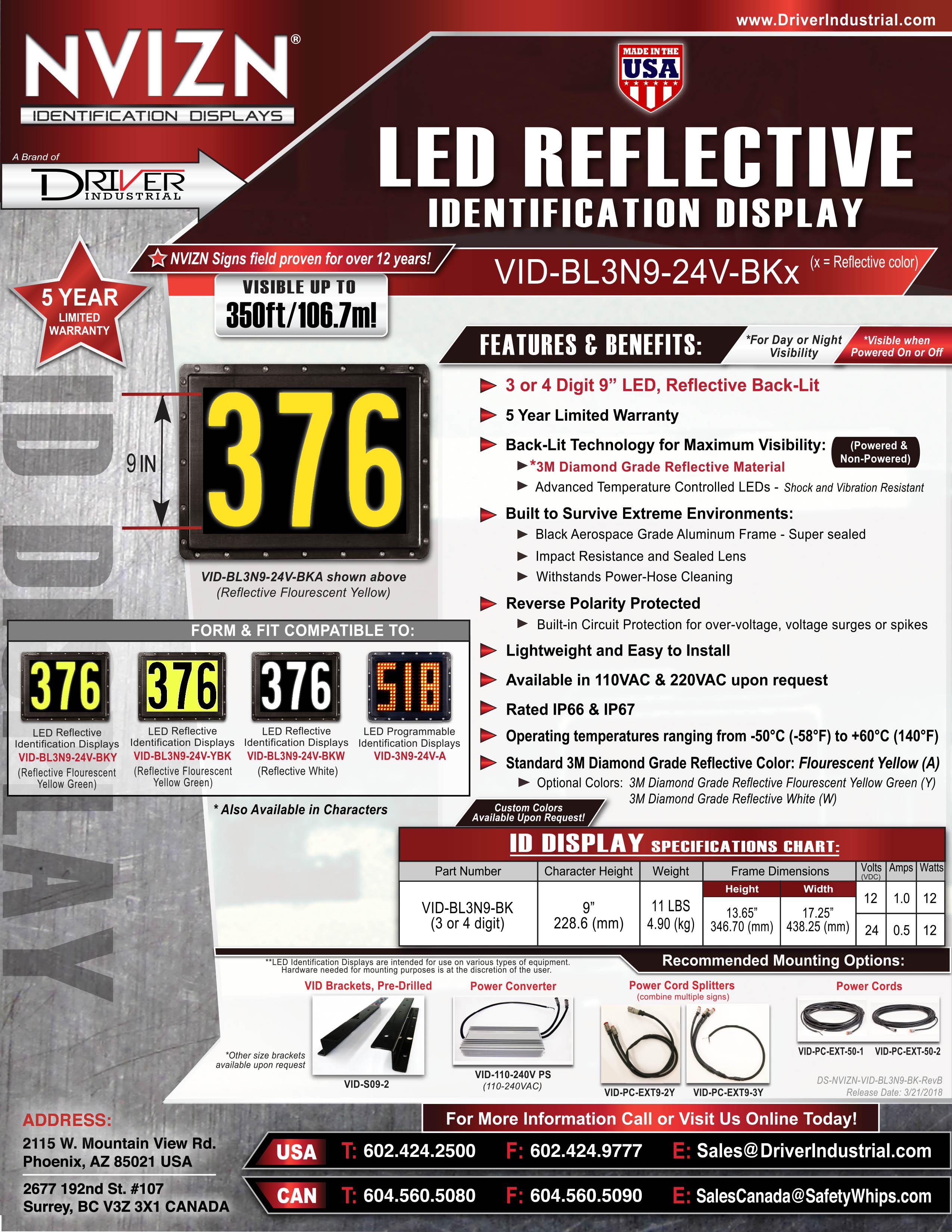 NVIZN LED Programmable Identification Display options are the most efficient form of LED display. Recognized globally for dependability, high visibility, and programmable functionality. Programmable displays provide the most robust and efficient way to identify vehicles and Heavy Equipment with Vehicle ID Numbers. NVIZN Identification Displays® are heavy duty fully functional displays available in 5 Types of Displays: Programmable LED, Messaging and Signaling, Reflective LED Backlit, 3-Sided Displays and Interchangeable LED Reflective Backlit and are available in various character sizes dependent on the type of display. Sizes for our different Types of Displays range from 9″, 12″, 18″, 24″, 36″, to 52″. All Types of our NVIZN Identification Displays® are Mine-Tough and are built to survive the most extreme harsh environments; they are super sealed to be extremely durable to withstand power-hose cleaning, and are made of Hard Anodized Black Aerospace-Grade Aluminum framing and other lightweight materials making all of our products light weight and easy to install. NVIZN Identification Displays® have an Industry Leading 5 Year Limited Warranty.